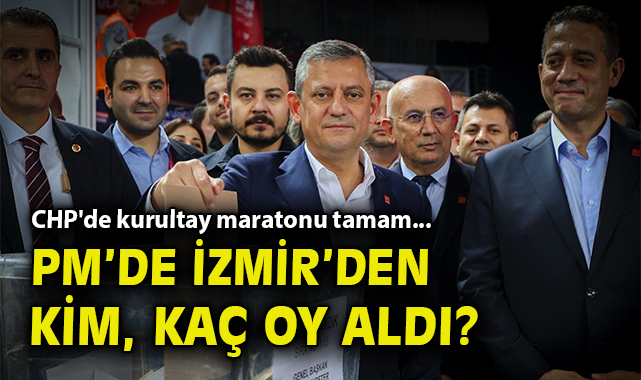 Cuhmuriyet Halk Partisi'nde kongre maratonu PM ve YDK seçimleri ile tamamlandı.Özgür Özel'in 4'üncü kez genel başkan seçildiği seçimlerde dün Parti Meclisi seçimleri de gerçekleştirildi.80 kişiye çıkarılan PM için Özgür Özel anahtar liste yayımlarken, seçim sonuçlarına göre liste delinmedi.Buna göre İzmir'den Deniz Yüce, Murat Bakan, Gökçe Gökçen PM'deki yerini korurken, Yankı Bağcıoğlu, Ednan Arslan, Bihlun Tamaylıgil ve Salih Uzun ise PM'ye eklenen yeni isimler oldu.İzmirli isimlerin PM oyları şu şekilde;Yankı Bağcıoğlu 1000