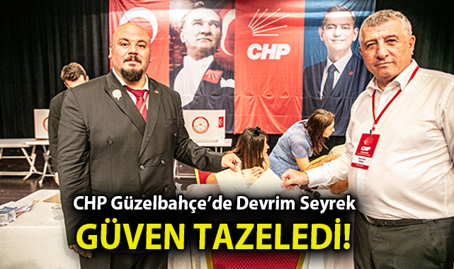 Mevcut İlçe Başkanı Devrim Seyrek güven tazeledi. Güzelbahçe Atatürk Kültür Merkezi Tuncel Kurtiz Konferans Salonu’nda gerçekleşen saygı duruşu ve İstiklal Marşı’yla başlayan kongreye CHP il yöneticileri, CHP Güzelbahçe İlçe Başkanı Devrim Seyrek ve ilçe yöneticileri, Güzelbahçe Belediye Başkanı Mustafa Günay, önceki dönem belediye başkanları, belediye meclis üyeleri ve partililer katıldı. Blok listeyle yapılan oylamada 180 delegenin 165’i oy kullanırken oyların tamamı geçerli oldu ve geçerli tüm oyları alan mevcut İlçe Başkanı Devrim Seyrek güven tazelemiş oldu.