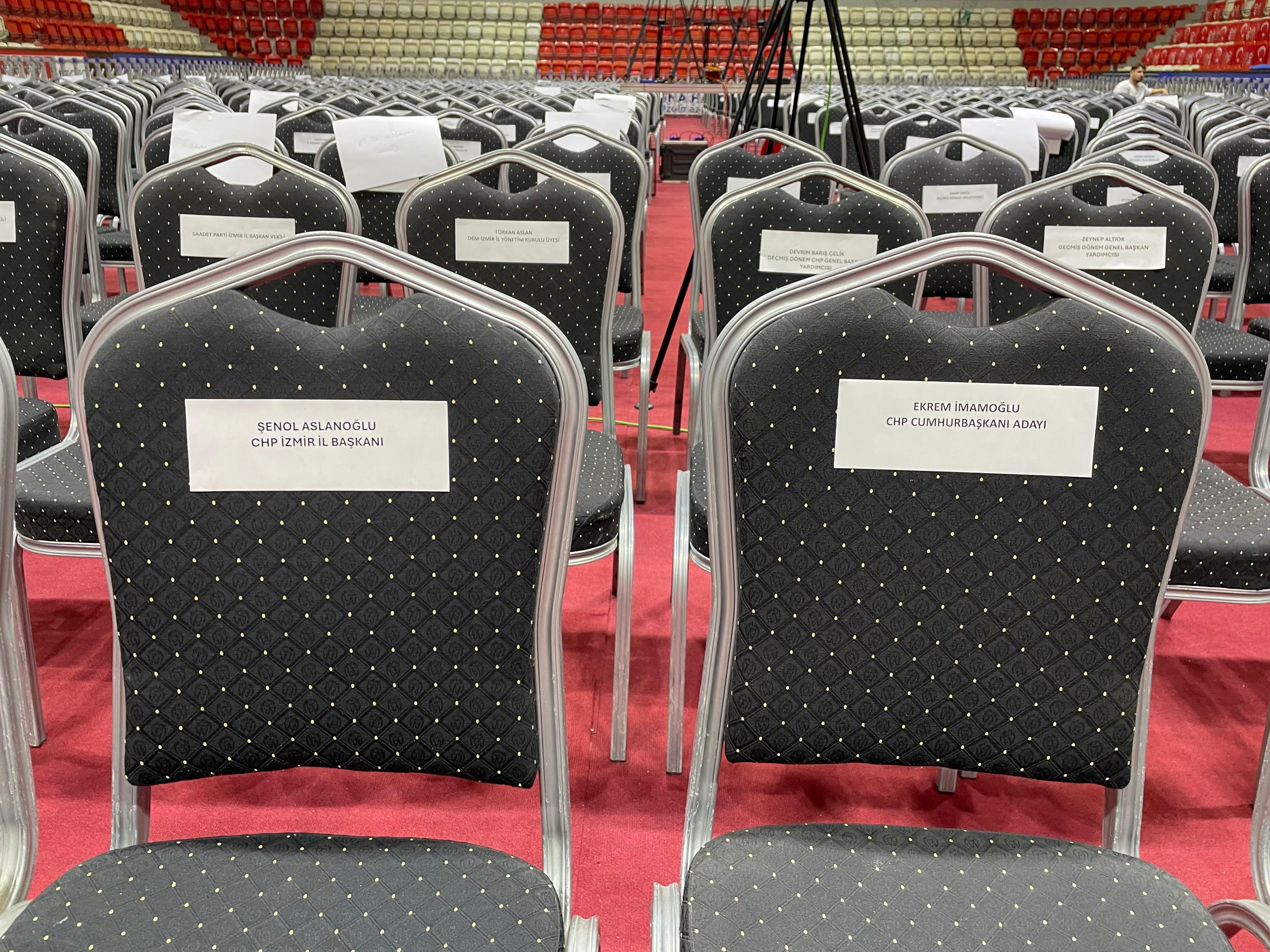 ASLANOĞLU VE İMAMOĞLU'NA ÖZEL KOLTUK Ev hapsinde bulunan mevcut İl Başkanı Şenol Aslanoğlu kongreye zoom üzerinden katılacak. Bir diğer cezaevinde bulunan İstanbul Büyükşehir Belediye Başkanı ve CHP Cumhurbaşkanı Adayı Ekrem İmamoğlu kongreye katılamazken iki isim için salonda yer ayrıldı.