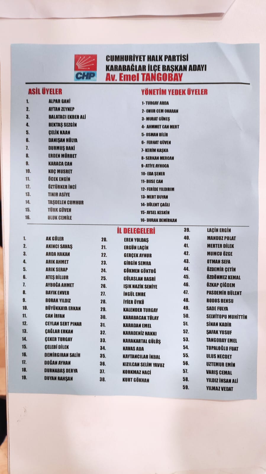 İlçe başkan adayı olan Emel Tangobay ilk olarak kürsüye çıkarken, “Bugün Atatürk’ün bizlere emaneti olan çağdaş Türkiye Cumhuriyeti son 20 yıldır hiç olmadığı kadar kuşatılmış ve toplum kuşatılmıştır. Kimse kimseyi yalnızlaştırmayı başaramayacaktır. Bugün de parti örgütüm beni Karabağlar ilçe başkanı adayı olmama yönünde görev çağırmıştır. Ben dün olduğu gibi bugün de örgütümden aldığım çağrıya hayır demedim. Tepeden inme ilçe başkan adayı değilim. Örgüt emekçisi olarak grupların değil, bütün CHP’nin adayıyım. Bizler bu mücadeleyi toplumun tüm kesimlerini Cumhuriyet etrafından birleştirerek yerelde başlatmayı hedeflemekteyiz. Örgütün devrimci ve demokrat anlayışı ile adayız. Karabağlar’da güçlü, dinamik, sesi gür çıkan örgüt yapısını hayata geçireceğiz. Bunu hep birlikte yapacağız. Ben sizlere güveniyorum. Örgüt içindeki erkesi barış danışma ve kucaklaşma içinde yol yürümesini istiyoruz. Biz ayrıştırmaya değil birleştirmeye geliyoruz. Karabağalar’da yeni bir sese, yeni bir soluğa ihtiyaç var. Biz Karabağlar da kadınlar ve gençler olarak bunu başaracağımıza inanıyoruz. Her zaman olduğu gibi yine güçlü bir örgüt olacağız” dedi.SÖZÜPEK: MAKAM ODALARINDA BELİRLENEN BİR ADAY DEĞİLİM