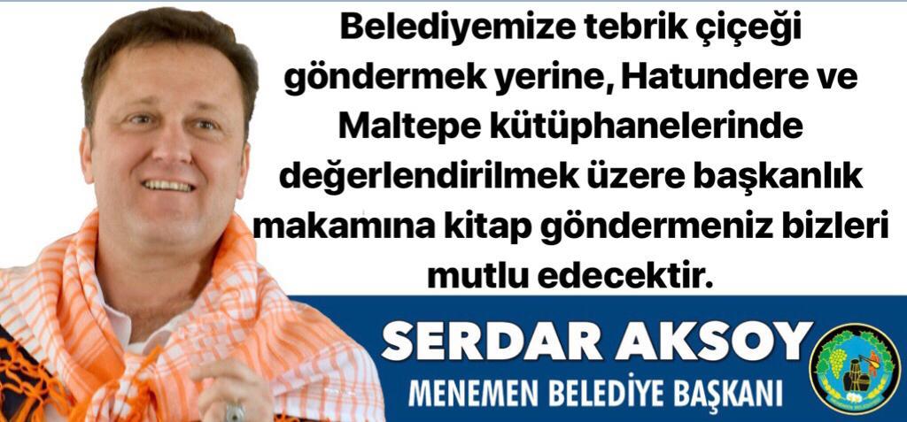 Yerel seçimlerde Menemen Belediye Başkanı olan Serdar Aksoy, mazbatasını almasının ardından kendisine gönderilen tebrik hediyeleri yerine bağış yapılması çağrısında bulundu. Başkan Aksoy, sosyal medya hesabından yaptığı paylaşımda, tebrik çiçeği göndermek yerine kitap bağışında bulunulabileceğini söyledi. CHP'li Aksoy yapılacak kitap bağışlarını makamına gönderebileceklerini de belirterek şunları söyledi: "Değerli dostlarım sizlerden ricamdır. Belediyemize tebrik çiçeği göndermek yerine, Hatundere ve Maltepe kütüphanelerinde değerlendirilmek üzere başkanlık makamına kitap göndermeniz bizleri mutlu edecektir. " dedi.