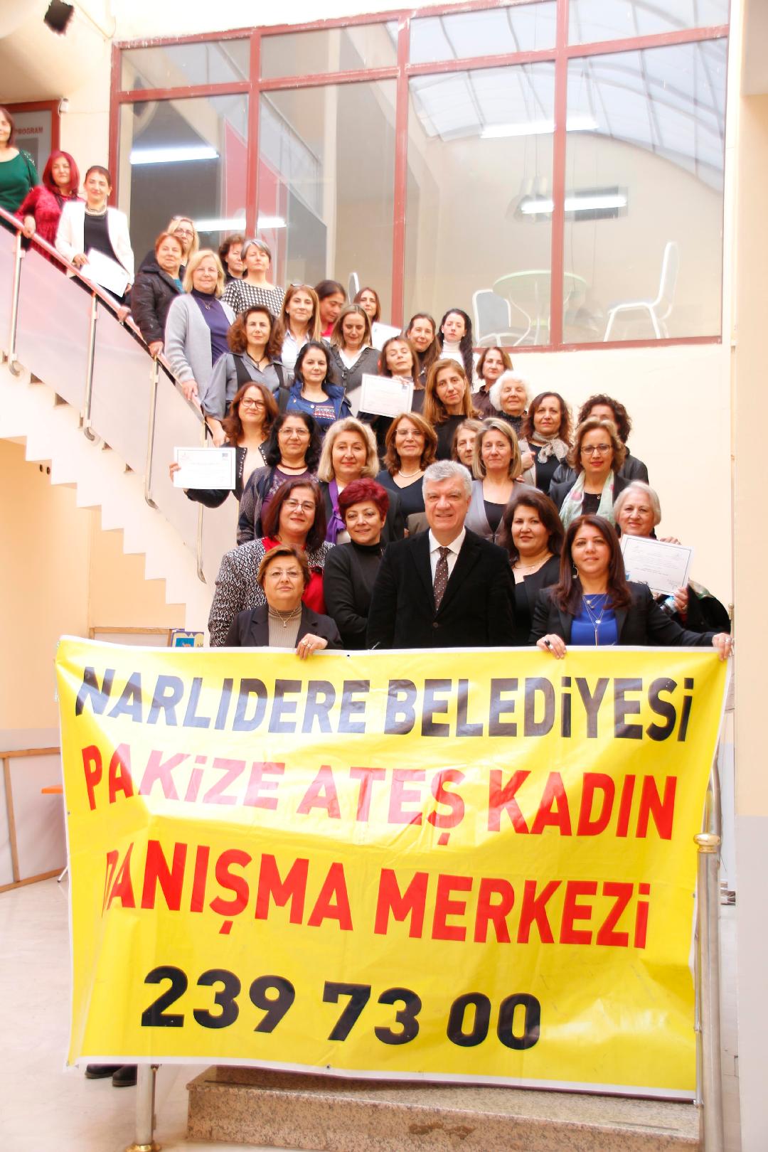 Toplam 18 kadının hukuk, insan hakları, cinsiyet eşitsizliği, doğurganlık, cinsellik gibi konularda bilinçlendirildiği eğitime katılan kursiyerlere sertifikalarını veren Ali Engin, kadınlarla toplu fotoğraf çektirdi. Törene, CHP Narlıdere İlçe Başkanı Şahin Fırat da katıldı.