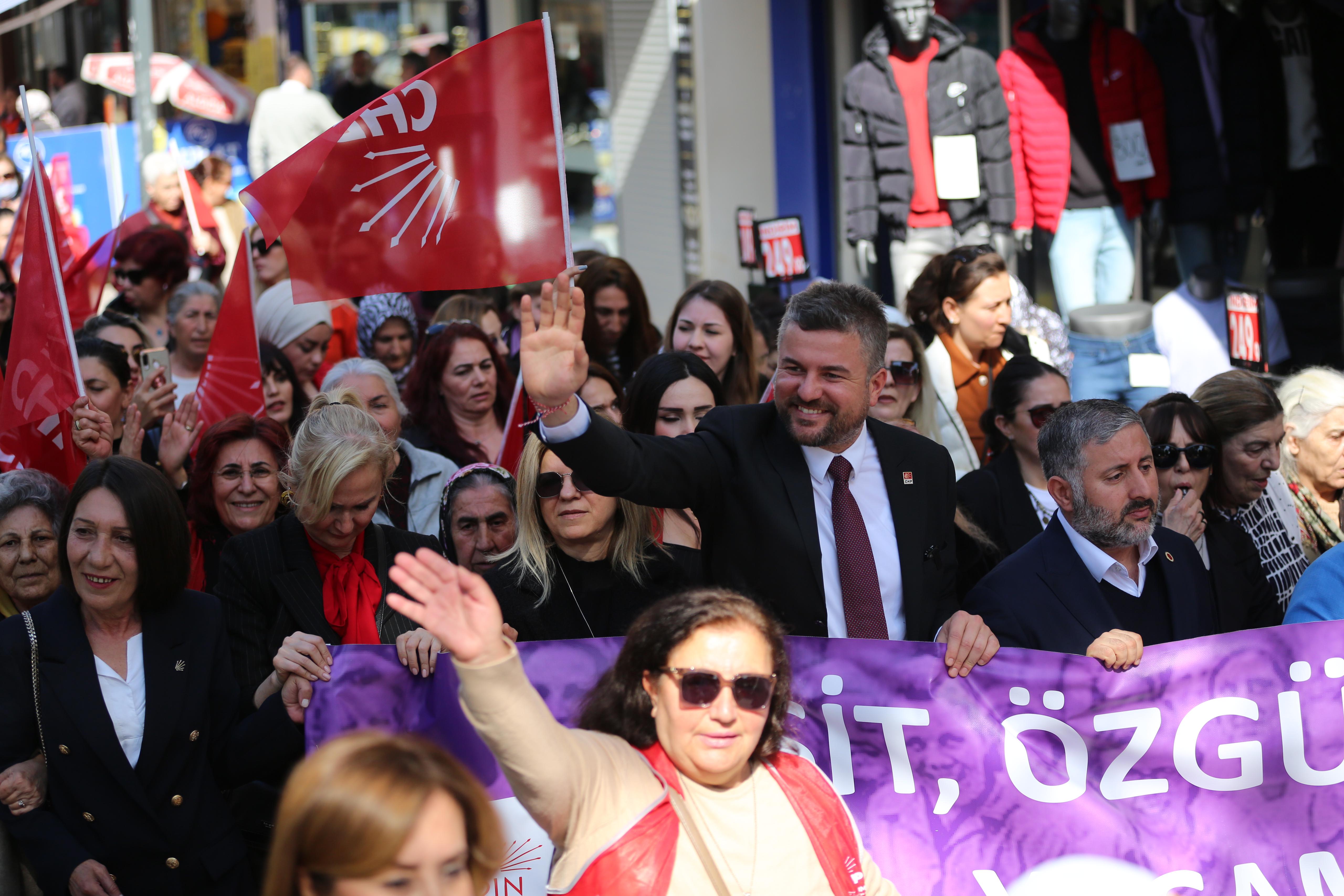 Toplantının ardından Bucalı kadınlarla birlikte Forbes Caddesi'nde kortej yürüyüşüne katılan Görkem Duman, kadınların attığı sloganlara katılarak, kadın dayanışmasına destek verdi