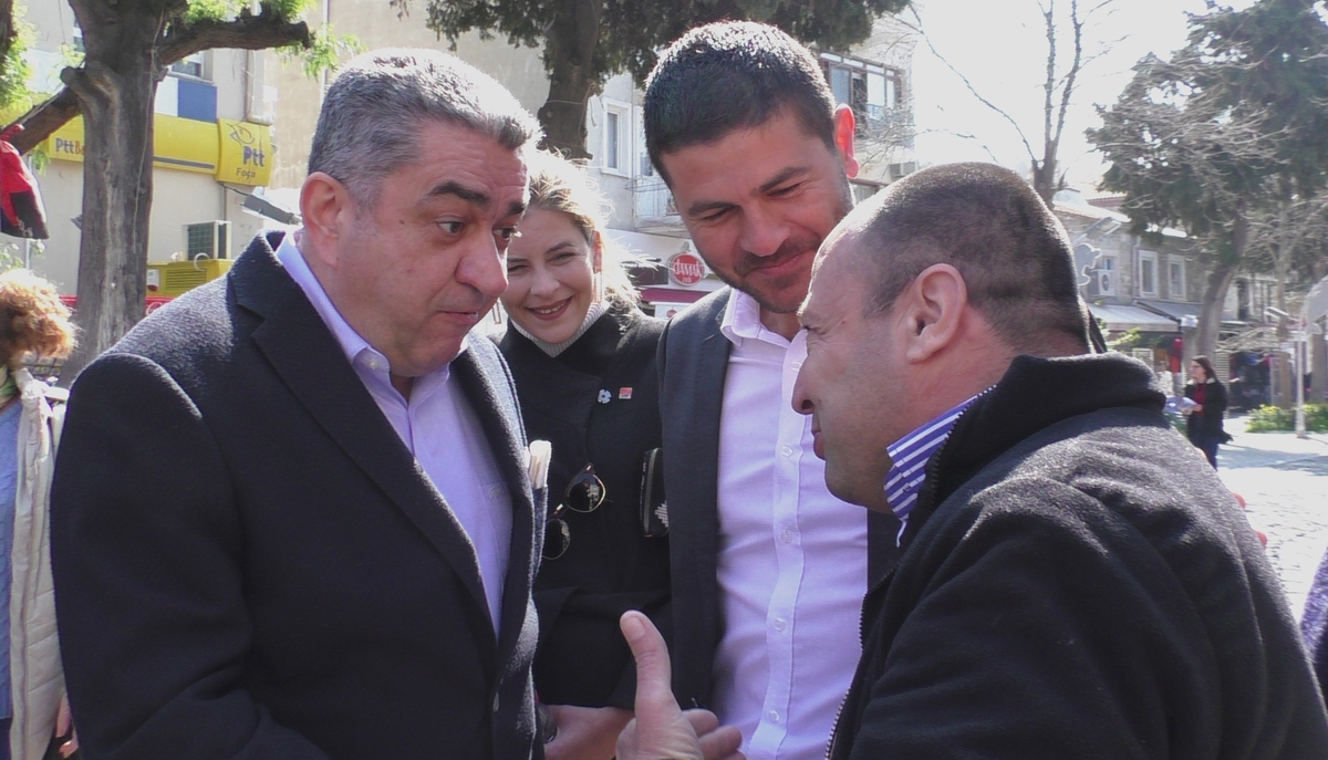 birlikte Foça Belediye Başkan Adayı Fatih Gürbüz'ü işaret eden bir vatandaş,