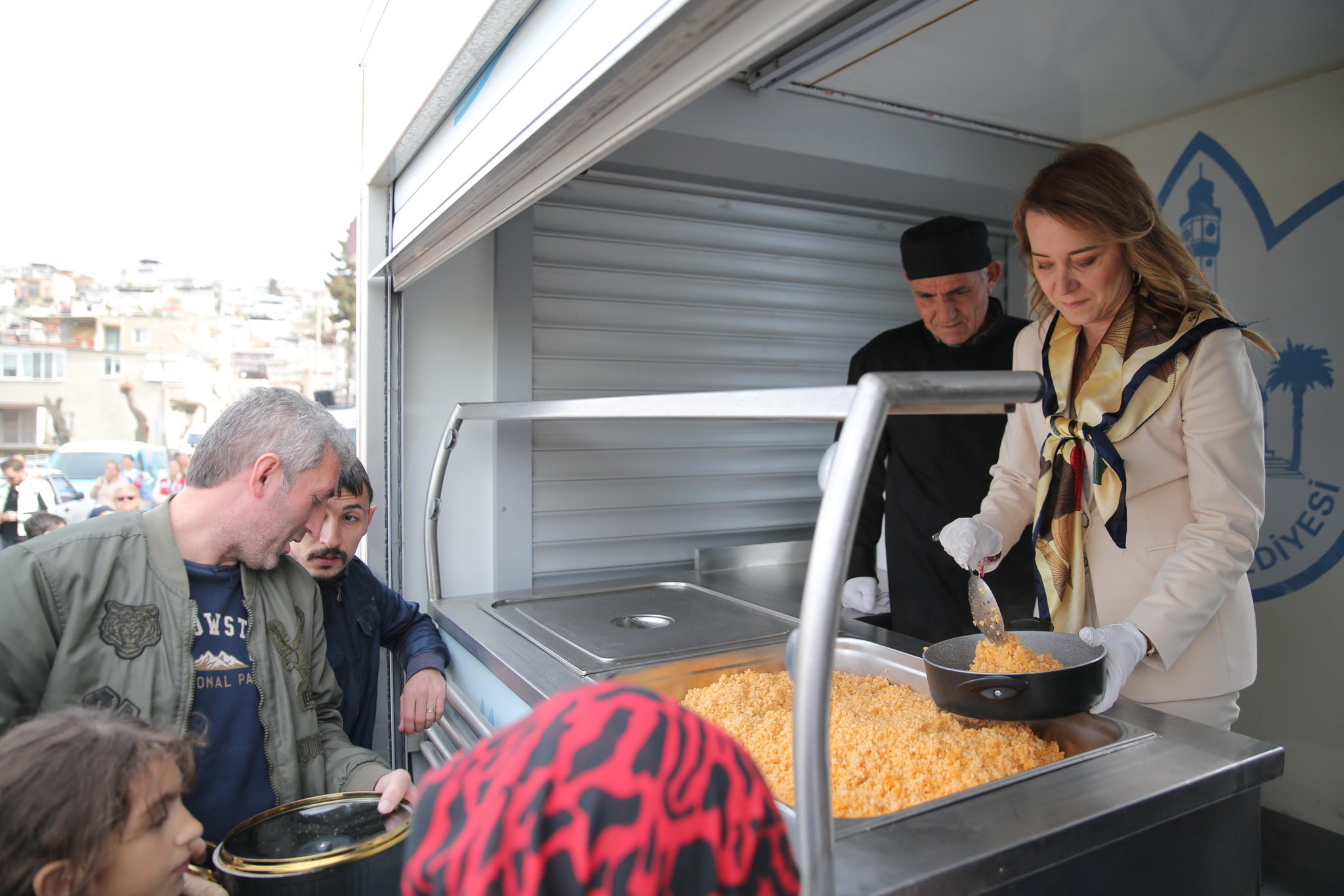 kazanlarının başına geçen Mutlu, elleriyle vatandaşlara yemek dağıttı. Mahallelilerle uzun uzun sohbet
