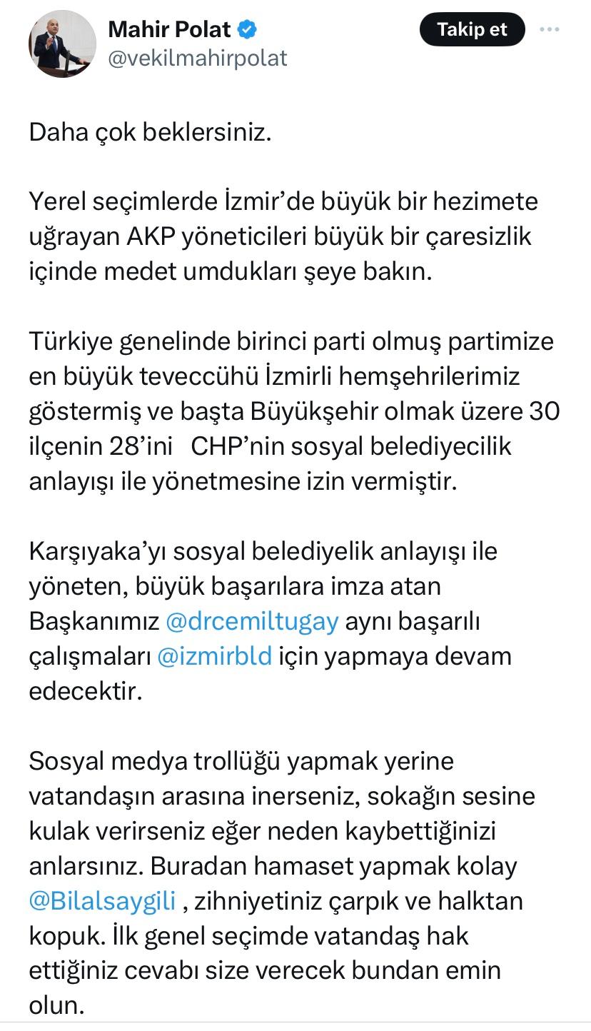 ÖNCÜŞEHİR- Yerel seçim sonrasında ekonomik kriz ve işçi maaşlarında yaşanan sorunlarla gündeme gelen Karşıyaka Belediyesi'nde dün alacaklıların kapıya dayandığı iddia edildi. Öte yandan haciz skandalı ile ilgili AK Parti İzmir İl Başkanı Bilal Saygılı dün konuya dair sosyal medya hesabından açıklamalarda bulunmuştu. Cumhuriyet Halk Partisi (CHP) İzmir Milletvekili Mahir Polat, AK Parti İzmir İl Başkanı Bilal Saygılı'yı hedef alarak sosyal medya hesabından paylaşım yaptı. Polat paylaşımında şu ifadeleri kullandı;"DAHA ÇOK BEKLERSİNİZ"Daha çok beklersiniz. Yerel seçimlerde İzmir’de büyük bir hezimete uğrayan AK Parti yöneticileri büyük bir çaresizlik içinde medet umdukları şeye bakın. Türkiye genelinde birinci parti olmuş partimize en büyük teveccühü İzmirli hemşehrilerimiz göstermiş ve başta Büyükşehir olmak üzere 30 ilçenin 28’ini CHP’nin sosyal belediyecilik anlayışı ile yönetmesine izin vermiştir."ZİHNİYETİNİZ ÇARPIK VE HALKTAN KOPUK"Karşıyaka’yı sosyal belediyelik anlayışı ile yöneten, büyük başarılara imza atan Başkanımız Cemil Tugay aynı başarılı çalışmaları İzmir Büyükşehir Belediyesi için yapmaya devam edecektir. Sosyal medya trollüğü yapmak yerine vatandaşın arasına inerseniz, sokağın sesine kulak verirseniz eğer neden kaybettiğinizi anlarsınız. Buradan hamaset yapmak kolay Bilal Saygılı zihniyetiniz çarpık ve halktan kopuk. İlk genel seçimde vatandaş hak ettiğiniz cevabı size verecek bundan emin olun.