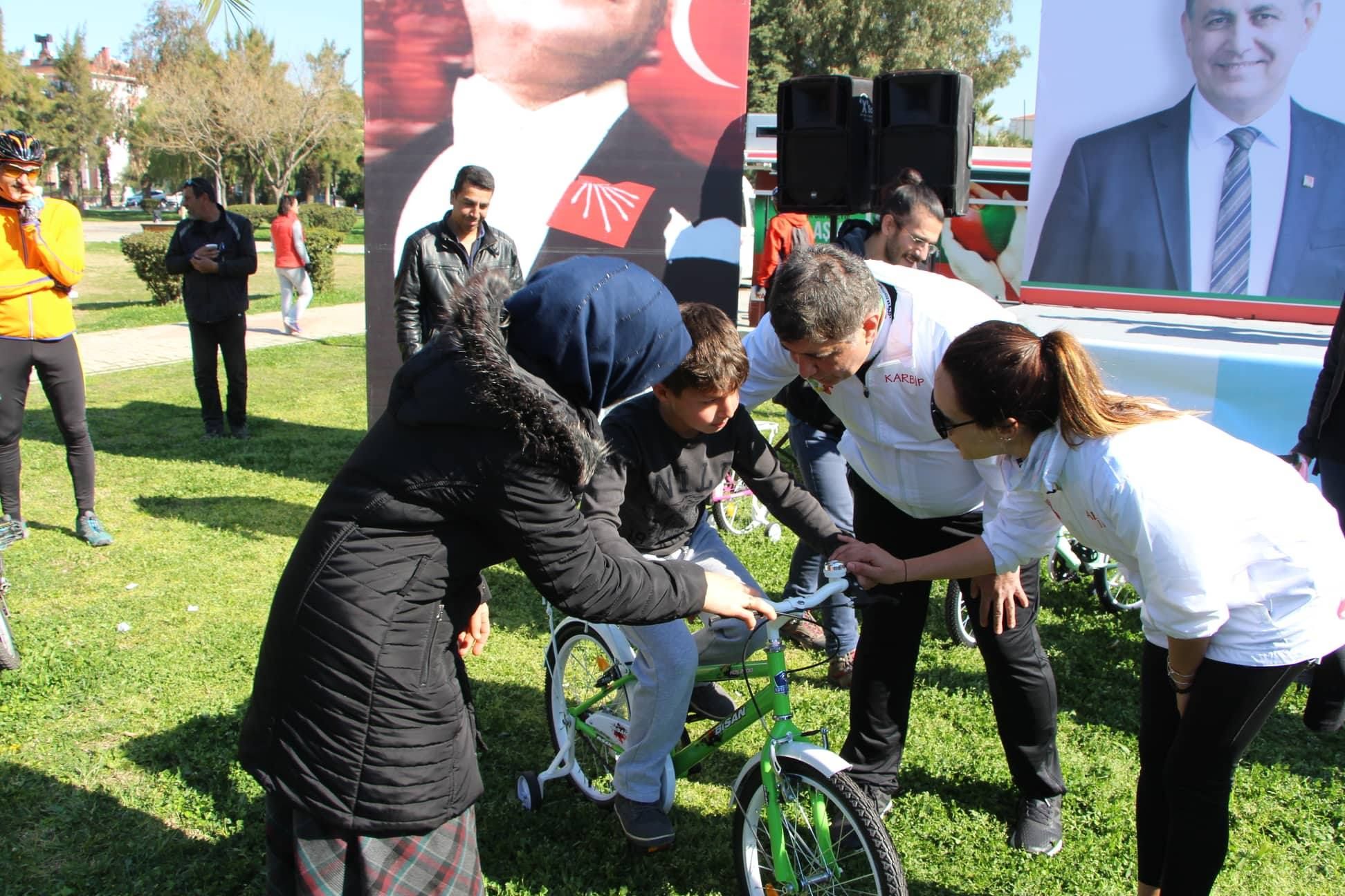 Karşıyaka Çarşı Girişi'nde toplanan bisikletli grup, Bostanlı Pazarı arkasındaki yeşil alana kadar pedal bastı. Cemil Tugay, etkinliğe eşi Öznur Tugay ve 10 yaşındaki kızı Alya ile birlikte katıldı. Etabın sonunda bisiklet tutkunları kendileri için düzenlenen alana ulaştı. Burada konuşan Cemil Tugay, Karşıyaka'nın bisiklet kullanımı için çok uygun bir ilçe olduğunu belirterek, "Biz ailece bisiklet aşığıyız. Fırsat buldukça kullanmaya çalışıyoruz. Önümüzdeki dönem için bu konuda 3 hedefimiz var. Birincisi ilçemizde sahil dışında yeni parkurlar oluşturmak, ikincisi Karşıyaka'da bisikleti olmayan ve bisiklet kullanmayı bilmeyen çocuğun kalmamasını sağlamak, üçüncüsü de Karşıyaka'nın uluslararası bisiklet organizasyonlarına ev sahipliği yapması olacak" diye konuştu.