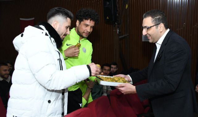 Demirspor müsabakası öncesi, teknik heyet ve oyuncuları ile bir araya gelerek takıma moral veren Onur Yiğit, baklava ikram etti.