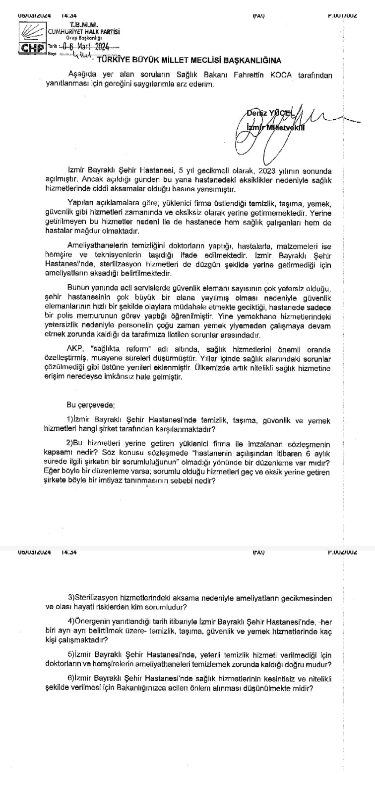 AKP iktidarları döneminde hayata geçirilen ve Erdoğan’ın “hayalim” dediği Şehir Hastaneleri, vatandaşa dert yükü olmaya devam ediyor. 5 yıl gecikmeli olarak, 2023 yılının sonunda açılan İzmir Bayraklı Şehir Hastanesi, açıldığı günden bu yana hastanedeki eksiklikler nedeniyle gündemden düşmüyor. CHP Parti Sözcüsü, Genel Başkan Yardımcısı ve İzmir Milletvekili Deniz Yücel, İzmir Bayraklı Şehir Hastanesi’nde sağlık hizmetlerinde ciddi aksamalar olduğunu bir soru önergesi vererek Meclis’e taşıdı. Sağlık Bakanı Fahrettin Koca’nın cevaplaması üzerine sorular yönelten Yücel, söz konusu sağlık skandalına ilişkin şunları söyledi:AKP İKTİDARLARI DÖNEMİ, SKANDALLARIN DÖNEMİ…“Bir hastane düşünün ki ameliyathanelerin temizliğini doktorlar yapıyor. Hastaları ve malzemeleri ise hemşire ve teknisyenler taşıyor. Yapılan açıklamalara göre; yüklenici firma üstlendiği temizlik, taşıma, yemek, güvenlik gibi hizmetleri zamanında ve eksiksiz olarak yerine getirmiyor. Bunun faturası da sağlık çalışanlarına ve hastalara kesiliyor. Üstelik İzmir Bayraklı Şehir Hastanesi’nde, sterilizasyon hizmetleri de düzgün şekilde yerine getirmediği için ameliyatların da aksadığı iddia ediliyor. Sağlık hizmeti veren bir kurumda sterilizasyon hizmetinin aksaması büyük bir skandal! AKP iktidarının skandalları bitmek bilmiyor.”ŞİMDİ DE DOKTORU GÜVENLİK GÖREVLİSİ Mİ YAPACAKSINIZ?Acil servislerde güvenlik elemanı sayısının yetersiz olduğuna, şehir hastanesinin çok büyük bir alana yayılmış olması nedeniyle güvenlik elemanlarının hızlı bir şekilde olaylara müdahale etmekte geciktiğine ve hastanede sadece bir polis memurunun görev yaptığına da değinen CHP’li Yücel, “Doktorları temizlik görevlisi yaptınız yetmedi, güvenlik elemanı yok diye şimdi de doktorları mı güvenlik görevlisi yapacaksınız? Yemekhane hizmetlerindeki yetersizlik nedeniyle personel çoğu zaman yemek yiyemeden, karnı aç bir şekilde çalışmaya devam etmek zorunda kalıyor. Şimdi böyle bir hastane henüz kendi doğal niteliklerini dahi yerine getiremiyorken sağlık hizmetini nasıl verecek?” dedi. CHP’Lİ YÜCEL’DEN SAĞLIK BAKANINA SORU ÖNERGESİAKP’nin “sağlıkta reform” adı altında, sağlık kurumlarını ticarethaneye dönüştürdüğünü, ülkede nitelikli sağlık hizmetine erişimin neredeyse imkânsız hale geldiğini dile getiren Yücel’in Bakan Koca’nın cevaplaması üzerine verdiği soru önergesi ise şöyle:1)İzmir Bayraklı Şehir Hastanesi’nde temizlik, taşıma, güvenlik ve yemek hizmetleri hangi şirket tarafından karşılanmaktadır?2)Bu hizmetleri yerine getiren yüklenici firma ile imzalanan sözleşmenin kapsamı nedir? Söz konusu sözleşmede “hastanenin açılışından itibaren 6 aylık sürede ilgili şirketin bir sorumluluğunun” olmadığı yönünde bir düzenleme var mıdır? Eğer böyle bir düzenleme varsa; sorumlu olduğu hizmetleri geç ve eksik yerine getiren şirkete böyle bir imtiyaz tanınmasının sebebi nedir?3)Sterilizasyon hizmetlerindeki aksama nedeniyle ameliyatların gecikmesinden ve olası hayati risklerden kim sorumludur?4)Önergenin yanıtlandığı tarih itibariyle İzmir Bayraklı Şehir Hastanesi’nde, -her biri ayrı ayrı belirtilmek üzere- temizlik, taşıma, güvenlik ve yemek hizmetlerinde kaç kişi çalışmaktadır?5)İzmir Bayraklı Şehir Hastanesi’nde, yeterli temizlik hizmeti verilmediği için doktorların ve hemşirelerin ameliyathaneleri temizlemek zorunda kaldığı doğru mudur?6)İzmir Bayraklı Şehir Hastanesi’nde sağlık hizmetlerinin kesintisiz ve nitelikli şekilde verilmesi için Bakanlığınızca acilen önlem alınması düşünülmekte midir?