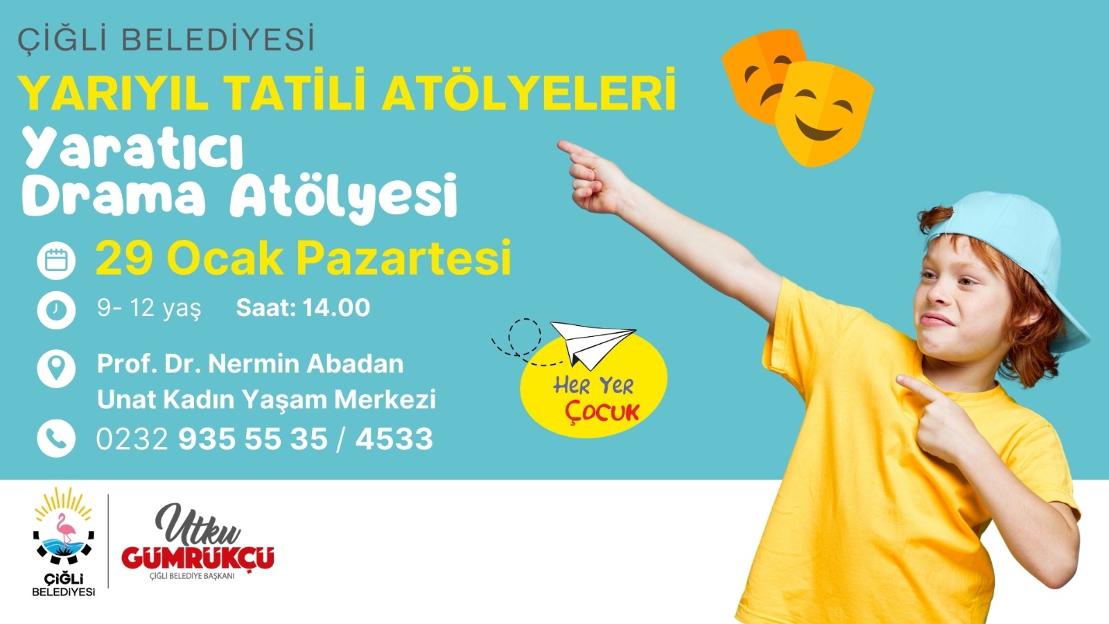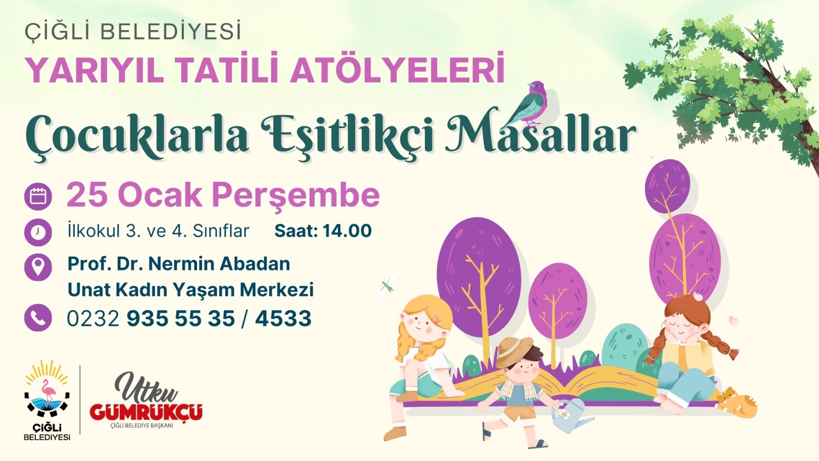 Her yıl düzenlediği etkinliklerle çocuklara öğretici ve eğlenceli bir tatil dönemi yaşatan Çiğli Belediyesi, 2023-2024 eğitim öğretim yılının sömestr tatilinde de karne coşkusu yaşayan çocukları unutmadı. Sömestr programı, 25 Ocak Perşembe günü 3. ve 4. Sınıf öğrencilerine yönelik düzenlenecek “Çocuklarla Eşitlikçi Masallar” etkinliği ile başlayacak. 26 Ocak Cuma günü 7-12 yaş arası çocuklar için Yaratıcı Ritim Atölyesi gerçekleştirilecek. 29 Ocak Pazartesi günü 9-12 yaş arası çocuklar için Yaratıcı Drama Atölyesi düzenlenecek. Program 31 Ocak Çarşamba günü 3. ve 4. Sınıf öğrencileri için düzenlenecek Öykü Okuma-Yazma etkinliği ile sona erecek. Çiğli Belediyesi Prof. Dr. Nermin Abadan Unat Kadın Yaşam Merkezi’nde düzenlenecek etkinliklere katılmak isteyenler 0232 935 55 35 (4533) numaralı hattan bilgi alabilecek.
