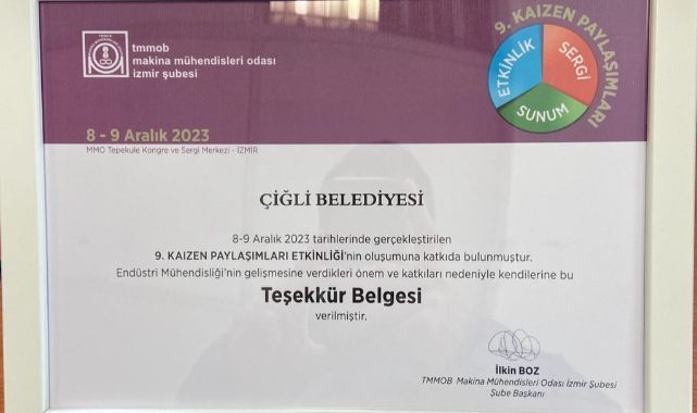 2014 yılından itibaren Makine Mühendisleri Odası İzmir Şubesi tarafından kurumlarda sürekli iyileştirme ve sürdürebilirliğin sağlanması amacıyla düzenlenen Kaizen Paylaşımları’nın dokuzuncusu Tepekule Kongre Merkezi’nde gerçekleştirildi. Çiğli Belediyesi, “TSE EN ISO 9001:2015 Kalite Yönetim Sisteminin QDMS ile Dijital Hale Getirilmesi” projesi ile sergilenmeye değer görülen 180 proje arasında yer alan tek kamu kurumu oldu. Etkinliğe ev sahipliği yapan Makine Mühendisleri Odası İzmir Şubesi, endüstri mühendisliğinin gelişmesine verdiği önem ve katkılardan dolayı Çiğli Belediyesi’ne Teşekkür Belgesi takdim etti.Başkan Gümrükçü: “Tasarruf odaklı çalışmalarımız devam edecek”Projeyle ilgi bilgi veren Çiğli Belediye Başkanı Utku Gümrükçü, “Kalite Yönetim Sistemi içerisinde kullanılan her türlü dokümanın güncelliği sağlanmış olup, çevre ve iklim açısından atık miktarlarını azaltmak amacıyla bu projeyi hayata geçirdik. Proje kapsamında belediyemizin kullanmış olduğu Kalite Dokümanları dijital hale getirildi. Şu ana kadar 4 bin yaprağa yakın kağıttan tasarruf sağlanmış olup bundan sonraki süreçte kağıt kullanımını tamamen bitirmeyi hedefliyoruz. Projenin hayata geçirilmesine katkı sunan çalışma arkadaşlarımıza ve bu anlamlı etkinlikte bizleri onurlandıran Makine Mühendisleri Odası İzmir Şubesine teşekkür ediyorum” ifadelerini kullandı.