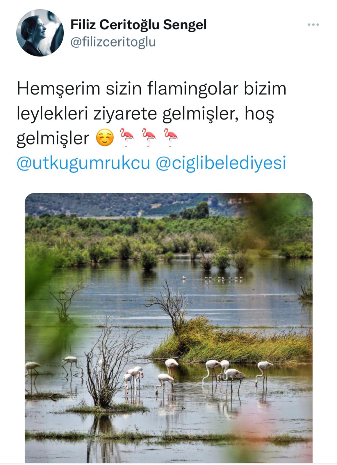 Fotoğrafta Pamucak yolu üzerinde bulunan flamingoların yer aldığı fotoğrafa Çiğli Belediye Başkanı Utku Gümrükçü ise, “Bizimkiler size emanet başkanım” sözleriyle cevap verdi.