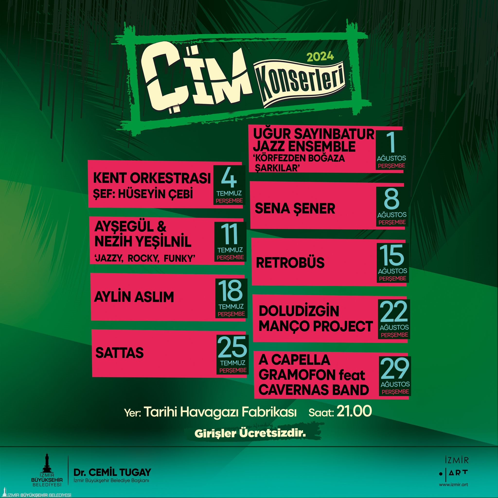 İzmir Büyükşehir Belediyesi tarafından bu yıl yedinci defa düzenlenen Çim Konserleri İzmirlileri yine sanatla buluşturacak. 4 Temmuz’da Kent Orkestrası ile başlayan program, birbirinden farklı sanatçı ve gruplarla Tarihi Havagazı Fabrikası’nda ücretsiz olarak İzmirlilerle buluşmayı sürdürecek. Çim Konserleri her hafta perşembe günü saat 21.00’de düzenlenecek.