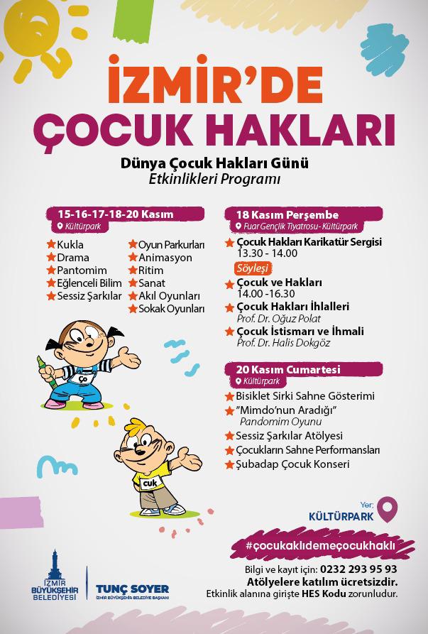 İzmir Büyükşehir Belediyesi 20 Kasım Dünya Çocuk Hakları Günü kapsamında bir haftalık etkinlik programı düzenledi. Çocuk haklarına dikkat çekmek, çocukları korumak ve yaşam koşullarını iyileştirmek amacıyla düzenlenen etkinlikler, 15–20 Kasım 2021 tarihleri arasında Kültürpark ve Seferihisar’da ara tatildeki çocuklara şölen tadında bir hafta yaşatacak.Kültürpark’ta eğlence“#çocukaklıdemeçocukhaklı" sloganıyla İzmir Büyükşehir Belediyesi Sosyal Projeler Dairesi Başkanlığı Çocuk Belediyesi Şube Müdürlüğü düzenlenen etkinlikler kapsamında Kültürpark’ta kukla, drama, pandomim, eğlenceli bilim, sessiz şarkılar, oyun parkurları, animasyon gösterisi, ritim, sanat, akıl oyunları ve sokak oyunları olmak üzere çok sayıda atölye kurulacak. 20 Kasım Cumartesi günü ise Bisiklet Sirki Sahne Gösterimi, Mimdo’nun Aradığı isimli pandomim oyunu, Sessiz Şarkılar Atölyesi, çocukların sahne performansı ve Şubadap Çocuk Konseri olacak.Yetişkinler için söyleşilerÇocuklar için hazırlanan etkinliklerin yanı sıra aileler başta olmak üzere tüm yetişkinleri bilinçlendirmek için 18 Kasım Perşembe günü Kültürpark Fuar Gençlik Tiyatrosu’nda söyleşi düzenlendi. Saat 13.30’da Çocuk Hakları Karikatür Sergisi’nin ardından saat 14.00 – 16.30 arasında Prof. Dr. Oğuz Polat’ın “Çocuk Hakları İhlalleri” ve Prof.Dr.Halis Dokgöz’ün “Çocuk İstismarı ve İhmali” adlı söyleşisi olacak.Seferihisar Çocuk Belediyesi’nde büyük günKültürpark’ta tüm hafta sürecek etkinliklerin yanı sıra İzmir Büyükşehir Belediyesi’nin Seferihisar Çocuk Belediyesi Yerleşkesi’nde de eğlence devam edecek. 19 Kasım Cuma günü 12.00 – 16.00 saatleri arasında bisiklet sirki, animasyon gösterileri, sahne gösterileri, atölyeler, parkur oyunları ve Şubadap Konseri miniklere keyifli anlar yaşatacak.Otobüslere “Çocuk Hakları” ayarıEtkinliklerin yanı sıra hafta boyunca çocuk haklarına dikkat çekmek için farkındalık çalışmaları başlatıldı. İzmir’in çeşitli yerlerine ulaşım sağlayacak ESHOT otobüslerine Dünya Çocuk Hakları Günü’ne özel giydirmeler yapıldı. Otobüsler, çocukların isim hakkı, vatandaşlık hakkı, yaşam hakkı, ifade özgürlüğü, çocuk haklarının kapsamı ve içeriği, sağlıklı yaşam hakkı, oyun hakkı ve özel hayatın gizliliğine saygı hakkı gibi bilgilendirme içeriklerinin yer aldığı görsellerle donatıldı. Otobüslerin içerisinde ise belirlenen koltuklar çocuklara ayrıldı. Koltukların üzerine “Güvenliği, sağlığı ve hakkı için bu koltuk çocuklara ayrılmıştır” yazılı etiketler yerleştirildi.