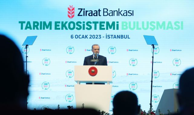 Cumhurbaşkanı Recep Tayyip Erdoğan, İstanbul'da Haliç Kongre Merkezi'nde düzenlenen Ziraat Bankası Tarım Ekosistemi Buluşması'na katıldı. Burada bir konuşma yapan Cumhurbaşkanı Erdoğan, Türkiye'nin nüfusunun 85 milyonu, dünya nüfusunun ise 8 milyarı bulduğu bir dönemde toprağı ve onu işleyen çiftçiyi ihmal edenin geleceği ihmal etmiş olduğunu söyledi. Her küresel kriz, gıda üretimi ve tedarikinin bu alanın ne kadar stratejik olduğunu kendilerine tekrar tekrar hatırlatmakta olduğunu ifade eden Cumhurbaşkanı Erdoğan, “Rusya-Ukrayna krizi sebebiyle tahıl sevkiyatının sekteye uğraması dünya çapında bir açlık tehdidini ortaya çıkardı. Türkiye olarak yürüttüğümüz çok yönlü diplomasiyle tahıl sevkiyatının başlamasını sağlayarak insanlığı çok büyük krizin eşiğinden döndürdük. Bu durum kendi tarım üretim kapasitemizin önemini de gösterdi. Hükümetlerimiz döneminde çiftçilerimize verdiğimiz desteklerin, sağladığımız kolaylıkların, yaptığımız düzenlemelerin ne kadar isabetli olduğunu bir kez daha ortaya koyduk. Tüm alanlarıyla birlikte tarım sektörü ve onun ana unsuru olan çiftçimizi bir bütün olarak görüyoruz. Tarlasını en modern ekipmanlarla süren çiftçimizle birlikte bu ekipmanları üreten, satan, finansmanını sağlayan kurumları ayrı tutmuyoruz. Gıda, tekstil, kozmetik sanayiine kadar bu alanda özellikle tüm yapıları aynı sistemin birer parçası olarak görüyoruz” dedi.“Ülkemizin tarıma uygun her karış toprağının en yüksek verimle ekilmesinin karşılığını sağlamayı hedefliyoruz”