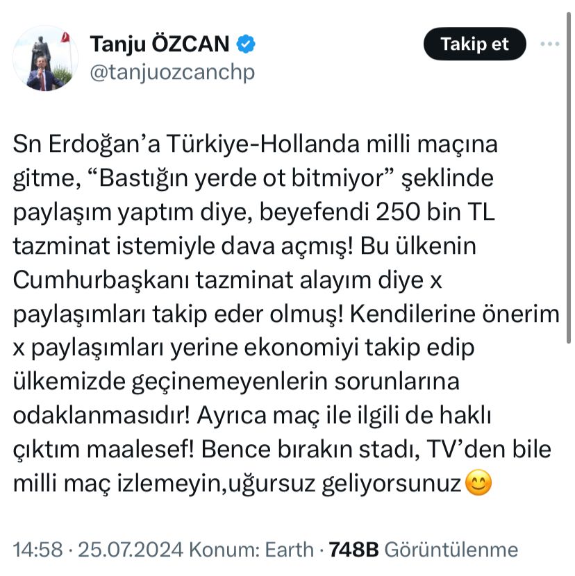 ÖNCÜŞEHİR - Cumhurbaşkanı Recep Tayyip Erdoğan, Cumhuriyet Halk Partili (CHP) Bolu Belediye Başkanı Tanju Özcan’a tazminat davası açtı.CHP’li Bolu Belediye Başkanı Tanju Özcan, durumu sosyal medya hesabından şu sözlerle duyurdu:"Sayın Erdoğan’a Türkiye-Hollanda milli maçına gitme, 'Bastığın yerde ot bitmiyor' şeklinde paylaşım yaptım diye, beyefendi 250 bin TL tazminat istemiyle dava açmış! Bu ülkenin Cumhurbaşkanı tazminat alayım diye x paylaşımları takip eder olmuş! Kendilerine önerim x paylaşımları yerine ekonomiyi takip edip ülkemizde geçinemeyenlerin sorunlarına odaklanmasıdır! Ayrıca maç ile ilgili de haklı çıktım maalesef! Bence bırakın stadı, TV’den bile milli maç izlemeyin,uğursuz geliyorsunuz"