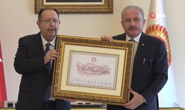Cumhurbaşkanı Recep Tayyip Erdoğan'ın mazbatası kendisine verilmek üzere Meclis Başkanı Mustafa Şentop tarafından alındı.