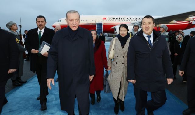 Cumhurbaşkanlığı’na ait özel uçak "TC-TUR" ile başkent Astana’daki Nursultan Nazarbayev Uluslararası Havalimanı'na inen Erdoğan, resmi törenle karşılandı.