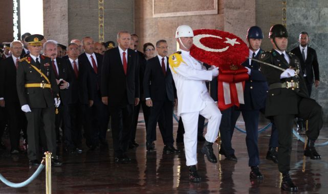 Cumhurbaşkanı Erdoğan'ın, Atatürk'ün mozolesine ay yıldız motifli çelenk bırakmasının ardından saygı duruşunda bulunuldu ve İstiklal Marşı okundu. Cumhurbaşkanı Erdoğan ve törende hazır bulunan devlet erkanı, daha sonra Misak-ı Millî Kulesi'ne geçti. Cumhurbaşkanı Erdoğan, burada Anıtkabir Özel Defteri'ni imzaladı.