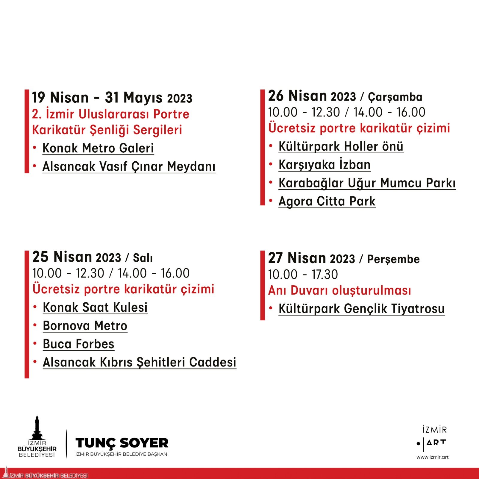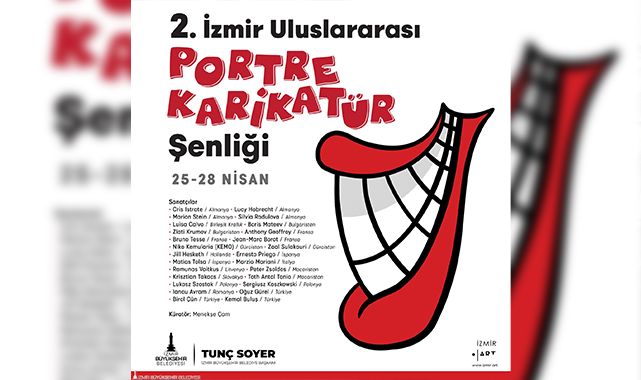 İzmir Büyükşehir Belediye Başkanı Tunç Soyer’in İzmir’i kültür sanat getirme hedefi doğrultusunda bu yıl ikincisi düzenlenecek İzmir Uluslararası Portre Karikatür Şenliği, 25 – 28 Nisan tarihlerinde 14 ülkeden 26 sanatçıyı ağırlayacak. Şenlik kapsamında sanatçıların eserlerinden oluşan sergiler 19 Nisan – 31 Mayıs tarihlerinde Alsancak Vasıf Çınar Meydanı ve Konak Metro Galeri’de sanatseverler ile buluşacak. Sanatçılar 27 Nisan’da ise birbirinden eğlenceli çizimlerden oluşan anı duvarı oluşturmak için Kültürpark Gençlik Tiyatrosu’nda buluşacak. 2. İzmir Uluslararası Portre Karikatür Şenliği’nin detaylı programına “kultursanat.izmir.bel.tr” adresinden ulaşılabilir.