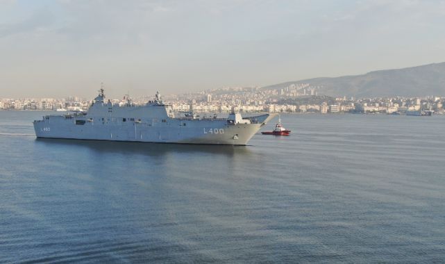İstanbul’dan yola çıkan TCG Anadolu, dün saat 19.15 sıralarında Çanakkale Şehitler Abidesini selamladı. Ardından Ege Denizine doğru yolculuğunu sürdüren Türkiye’nin en büyük askeri gemisi, sabah saat 06.40 sıralarında İzmir Körfezine giriş yaptı. TCG Anadolu, İzmir’e giriş yaptığı sırada körfez gemi trafiğine kapatıldı. Devasa geminin geçişi sırasında 6 römorkör ve sahil güvenlik botlarının gemiye eşlik ettiği görüldü. İzmir limanına demir atan geminin körfezden geçişi de drone ile görüntülendi.
