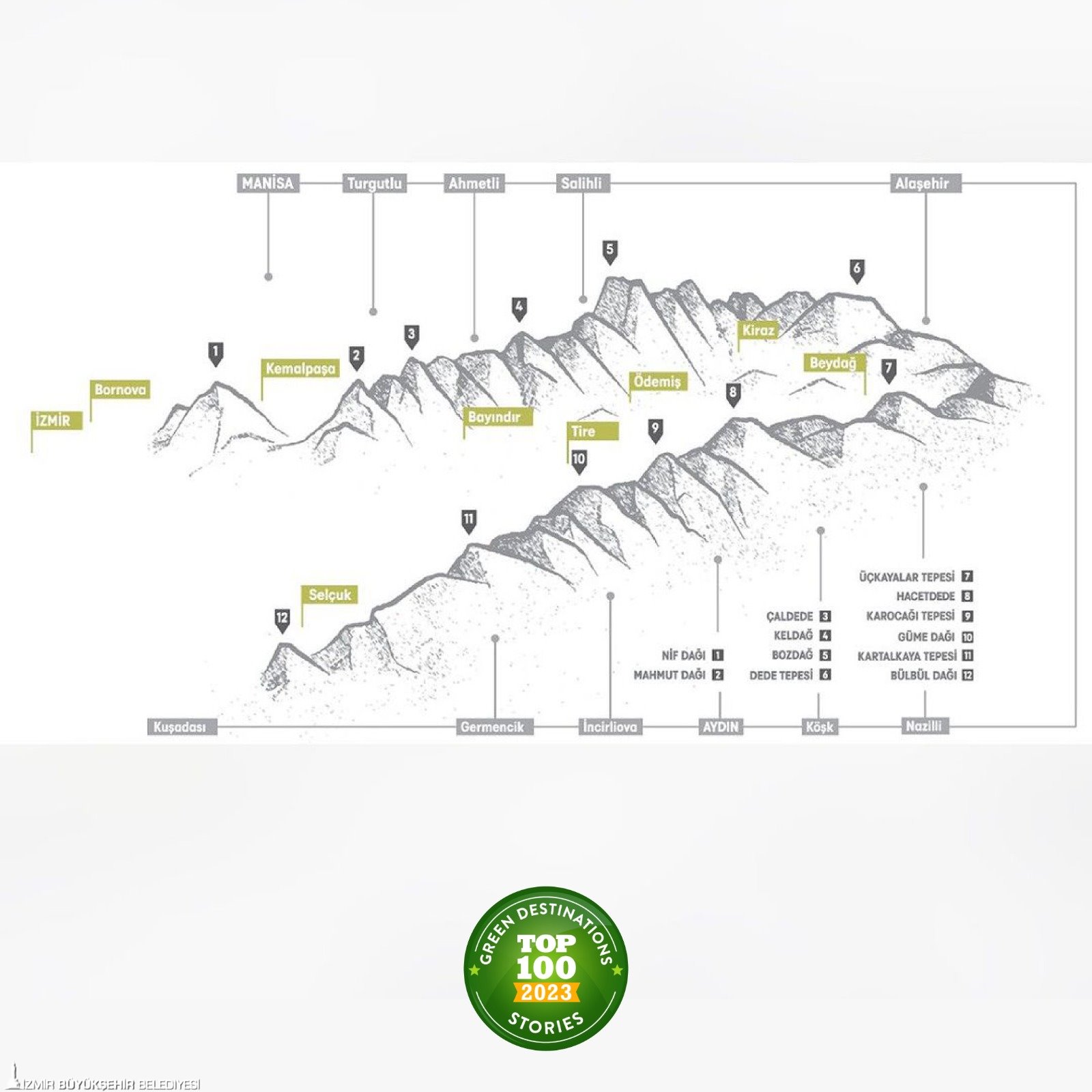 Her yıl İzmir Büyükşehir Belediyesi’nin de üyesi olduğu Küresel Sürdürülebilir Turizm Konseyi’nin (Global Sustainable Tourism Council – GSTC) akredite kuruluşu olan Green Destinations tarafından En İyi 100 Hikâye yarışması düzenleniyor. Yarışmayla, turizm profesyonellerinden gezginlere kadar bütün turizm sektörüne ilham verici örneklerin paylaşılması amaçlanıyor. Dünyanın dört bir yanındaki destinasyonlardan, en iyi sürdürülebilir turizm hikâyeleri bir araya getiriliyor.