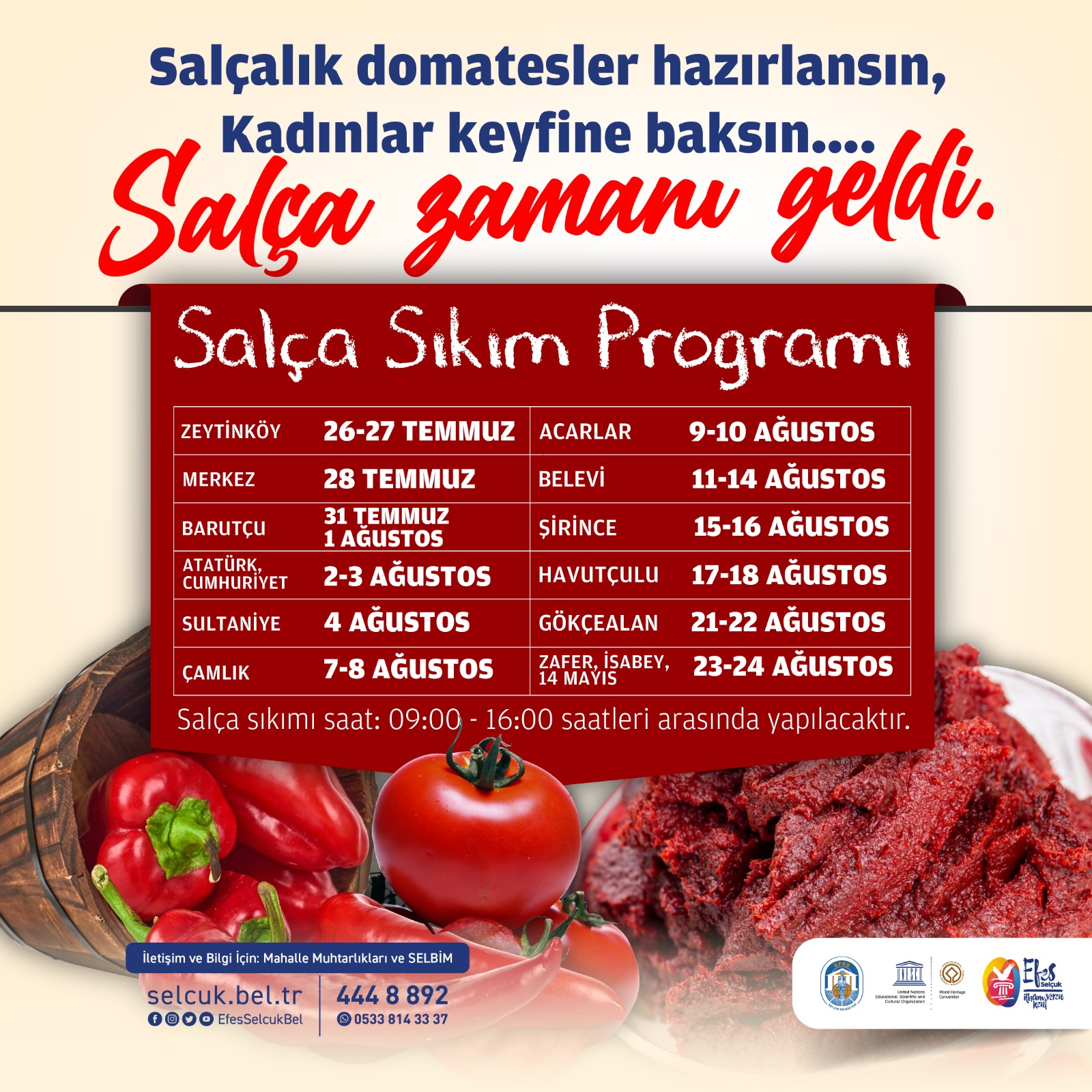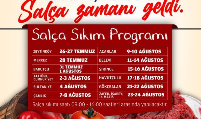 Kış hazırlıkları içinde önemli bir yer tutan salça yapımını kolaylaştıran salça makinası belirtilen tarihlerde (09.00- 16.00 saatleri arasında) köylerde ve merkez mahallelerde olacak.