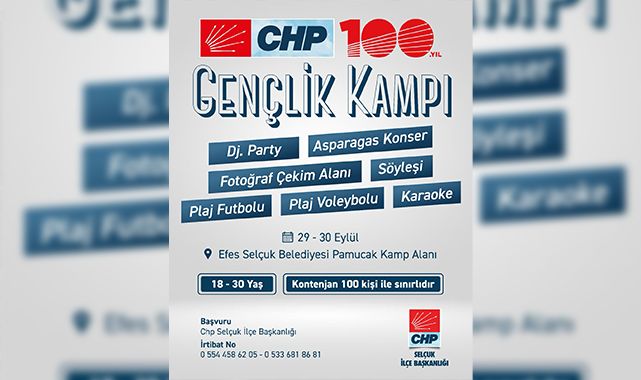 Yerel seçim öncesi CHP Efes Selçuk İlçe Başkanlığının organizasyonu ile Pamucak kamp alanında yapılacak olan Gençlik Kampı için başvuruların CHP İlçe Başkanlığına yapılacağı bildirildi. Cumhuriyet Halk partisinin 100.yılında 100 genci 29-30 Eylül'de Pamucak'ta gerçekleşecek olan Gençlik Kampına davet eden CHP Efes Selçuk İlçe Başkanı İpek Onbaşıoğlu, "Müzik, spor, söyleşi ve çeşitli eğlence etkinliklerinin yer alacağı bu kampı sakın kaçırmayın" dedi.