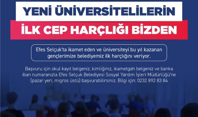 Efes Selçuk Belediyesi’nin yükseköğrenime başlayan gençlere sunduğu harçlık desteğinden yararlanmak isteyen öğrencilerin okul kayıt belgesi, kimlik, ikametgâh ve IBAN numaraları ile Efes Selçuk Belediyesi Sosyal Yardım İşleri Müdürlüğü’ne (Pazar yeri, Migros üstü) başvurmaları gerekiyor.