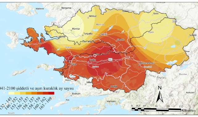 Araştırma, 2041-2100 döneminde şiddetli ve aşırı kuraklık ayı sayısının en yüksek olduğu bölgelerin Büyük Menderes Havzası (Aydın-Denizli-Muğla hattı) ile Küçük Menderes Havzası'nın batı kesimleri (Çeşme, Seferihisar, Selçuk ve çevresi) olduğunu gösteriyor. Bu alanlarda toplam 160 ayın üzerine çıkan kuraklık değerleri dikkat çekiyor. Küçük Menderes'in doğu kesimlerinde ve Gediz Havzası'nda ise kuraklık riski devam ediyor. Orta emisyon senaryosuna göre 2070-2099 arasında kurak ay sayısında yüzde 26 artış öngörülürken, yüksek senaryoda bu oran yüzde 40'a yaklaşıyor.