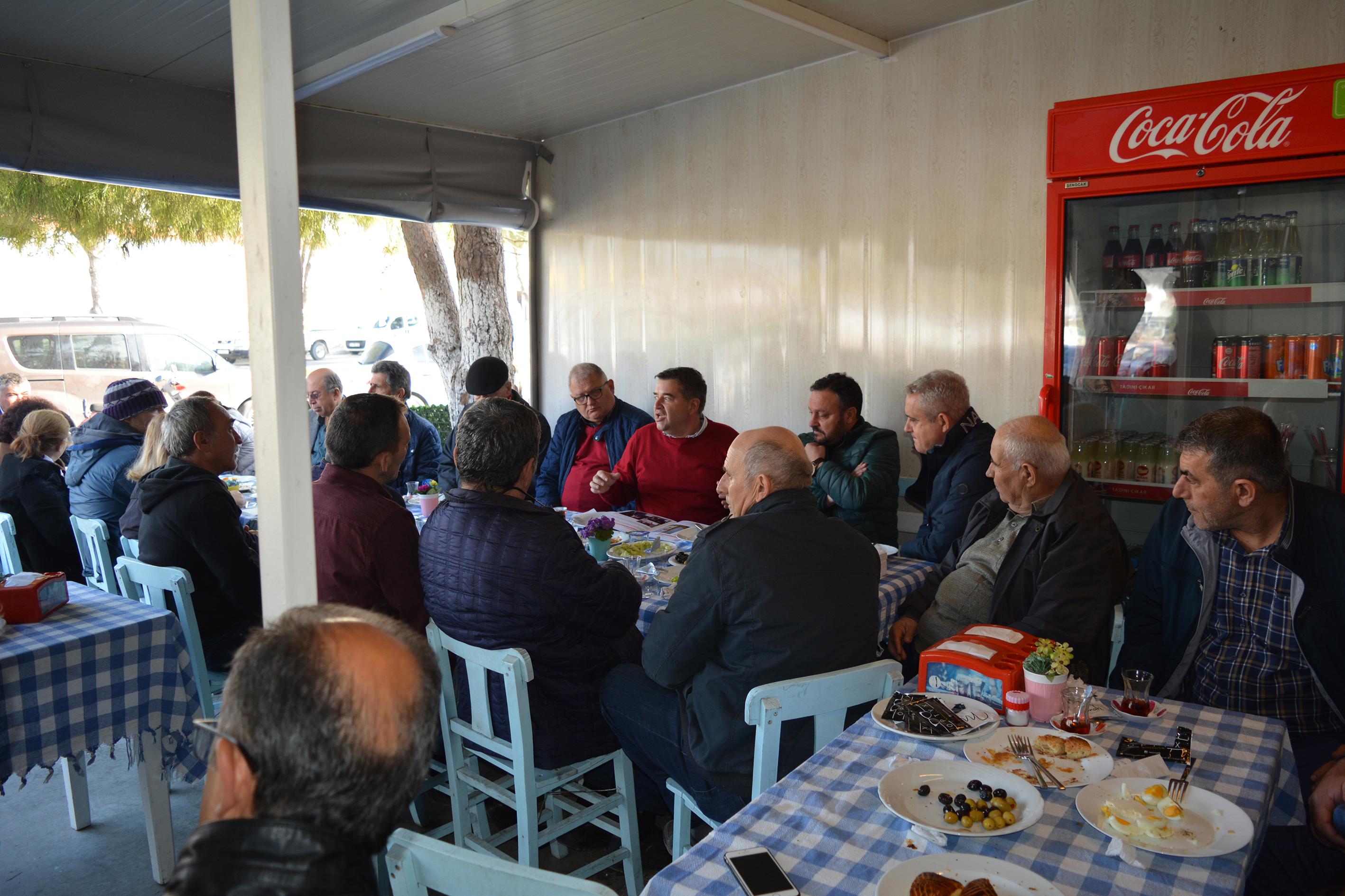 Güne, Alaçatı Küçük Sanayi Sitesi esnafıyla kahvaltı ederek