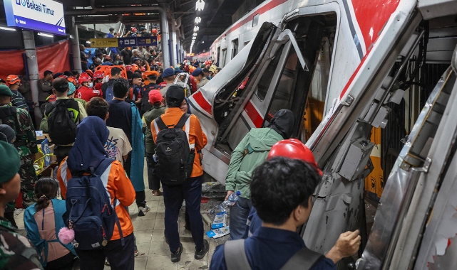 Endonezya'nın Bekasi şehrinde şehirlerarası Argo Bromo Anggrek treni, yerel saatle 20.50 civarında Bekasi Timur İstasyonu'ndaki Jakarta-Bekasi banliyö treninin arka vagonuna çarptı. Banliyö treninde çok sayıda yolcu sıkışarak mahsur kaldı. Bölgeye çok sayıda polis, sağlık ve kurtarma ekibi sevk edildi. Ekipler banliyö treninde sıkılan yolculara saatler süren çalışmaların ardından ulaşabildi. Devlete ait KAI demiryolu şirketi, feci kazada 14 kişinin hayatını kaybettiğini, 84 kişinin de yaralandığını ifade etti. Endonezya Cumhurbaşkanı Prabowo Subianto, sabah saatlerinde hastanedeki yaralıları ziyaret etti. Subianto, olayın hızlı bir şekilde soruşturulacağı sözü verdi.