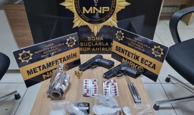 Manisa İl Emniyet Müdürlüğü Soma Narkotik Suçlarla Mücadele Grup Amirliği görevlilerince uyuşturucu veya uyarıcı madde ticareti yapan, nakleden ve kullanan şahıslara yönelik yapılan çalışmalar dahilinde Soma ilçesinde bir ikamette yapılan aramada; 28 adet sentetik ecza hapı, 40 gram metamfetamin maddesi, 2 adet 9 mm ruhsatsız tabanca ve 8 adet fişek ile uyuşturucu madde paketlemede kullanılan malzemeler ele geçirildi. Konuyla ilgili 5 şüpheli şahıs 'Uyuşturucu veya uyarıcı madde imal ve ticareti yapmak' suçundan gözaltına alındı. Emniyetteki işlemlerinin ardından adli makamlara sevk edilen 5 kişiden T.T. (28) isimli şahıs tutuklandı.
