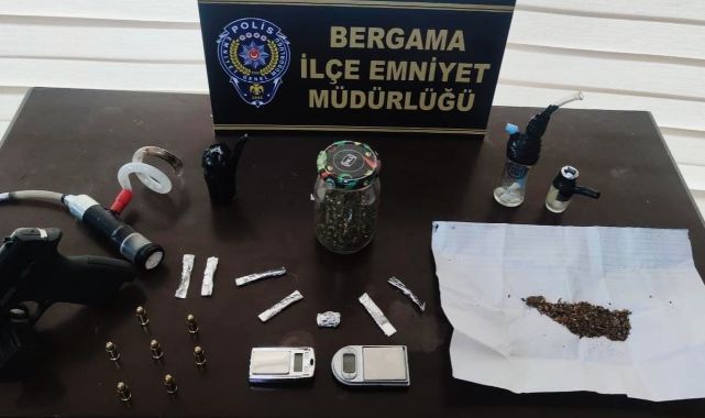 Bergama İlçe Emniyet Müdürlüğü Asayiş Büro Amirliği ekipleri, ilçede uyuşturucu madde ticareti yaptığı belirlenen G.G.'yi takibe aldı. Yürütülen teknik ve fiziki takibin ardından şüphelinin adresine polis ekipleri tarafından operasyon gerçekleştirildi. Adreste yapılan aramada, kavanoz içerisinde ve kağıda sarılı halde esrar maddesi, bir miktar metamfetamin, 2 hassas terazi, 1 adet ruhsatsız tabanca ve tabancaya ait fişek ile uyuşturucu ticaretinden elde edildiği belirlenen 3 bin 940 lira nakit para ele geçirildi.