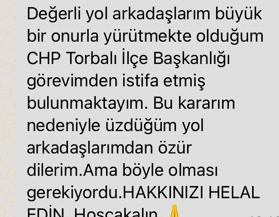 Edinilen bilgilere göre Torbalı Belediye Başkanı Övünç Demir ile yakınlığıyla bilinen CHP Torbalı İlçe Başkanı Hakkı Polat istifa etti.