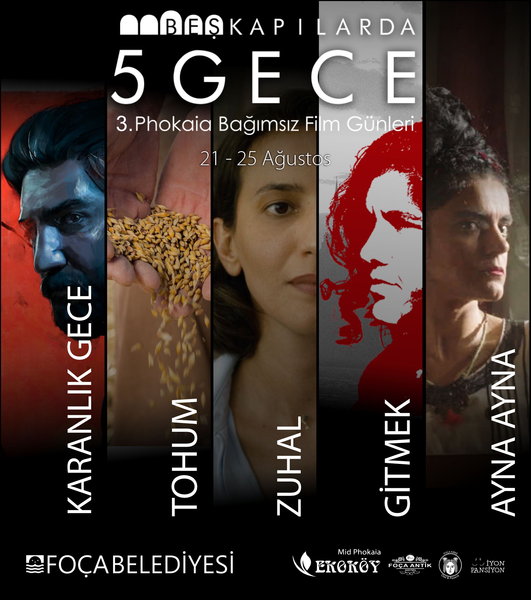 Foça Belediyesi’nin destekleri, Yönetmen Hüseyin Karabey ile sinema ve dizi oyuncusu Gizem Erman Soysaldı’nın Sanat Yönetmenliğini yaptıkları “Beşkapılarda 5 Gece” Phokaia Bağımsız Film Günleri, bu yıl da çok özel bir seçki ile sinemaseverlerle buluşacak.Film Günleri’nde bu yıl, yönetmen Özcan Alper’in imzasını taşıyan ‘Karanlık Gece’, Sevinç Baloğlu’nun çektiği belgesel türündeki ‘Tohum’, Nazlı Elif Durlu’nun yönettiği ‘Zuhal’, yönetmenliğini Hüseyin Karabey’in yaptığı ‘Gitmek’ ve Belmin Söylemez’in senaryosunu Haşmet Topaloğlu ile birlikte yazıp yönettiği ‘Ayna Ayna’ isimli filmler gösterilecek.Sanatın birleştirici gücünün tarihin eşsiz dokusunda beyaz perdeye yansıyacağı Sinema Günleri’nde, tarihi atmosferiyle Beşkapılar Kalesi 5 gece boyunca 5 filme kapılarını açacak.Beşkapılar Kalesi’ndeki film gösterimleri sonrasındaki söyleşilerde filmlerin yönetmenleri ve oyuncuları seyircilerle bir araya gelecek.Foça’nın, eşsiz doğası ve tarihi dokusuyla sanata ev sahipliği yapacağı etkinlik kapsamında ‘Çocuklarla Film Okuma Atölyesi’ de yapılacak. Sinema Günleri, Foça halkıyla birlikte; işbirliği yapılan üniversitelerin öğrencilerine, turistlere ve gezgin sinemaseverlere açık havada muhteşem bir sinema şöleni sunacak.