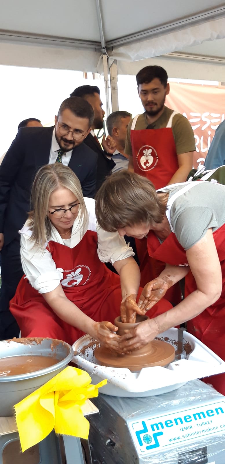 İzmir Milletvekili Ceyda Bölünmez Çankırı, yabancı eğitmenin yardımı ile çamura şekil vererek, çömlek yapmayı öğrendi.