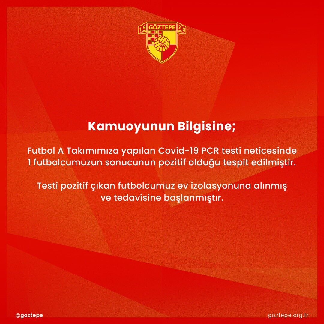 Süper Lig ekiplerinden Göztepe'de korona virüs şoku yaşandı. Sarı-kırmızılı kulüp sosyal medya hesaplarından yaptığı açıklamayla 1 futbolcusunda korona virüs vakasına rastlandığını duyurdu. İzmir temsilcisi, testi pozitif çıkan futbolcunun ev izolasyonuna alınarak tedavisinin başladığını duyurdu.
