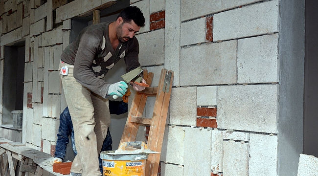 kaplanarak binaya estetik bir görünüm kazandırılıyor. Taş işçiliğinin devam ettiği