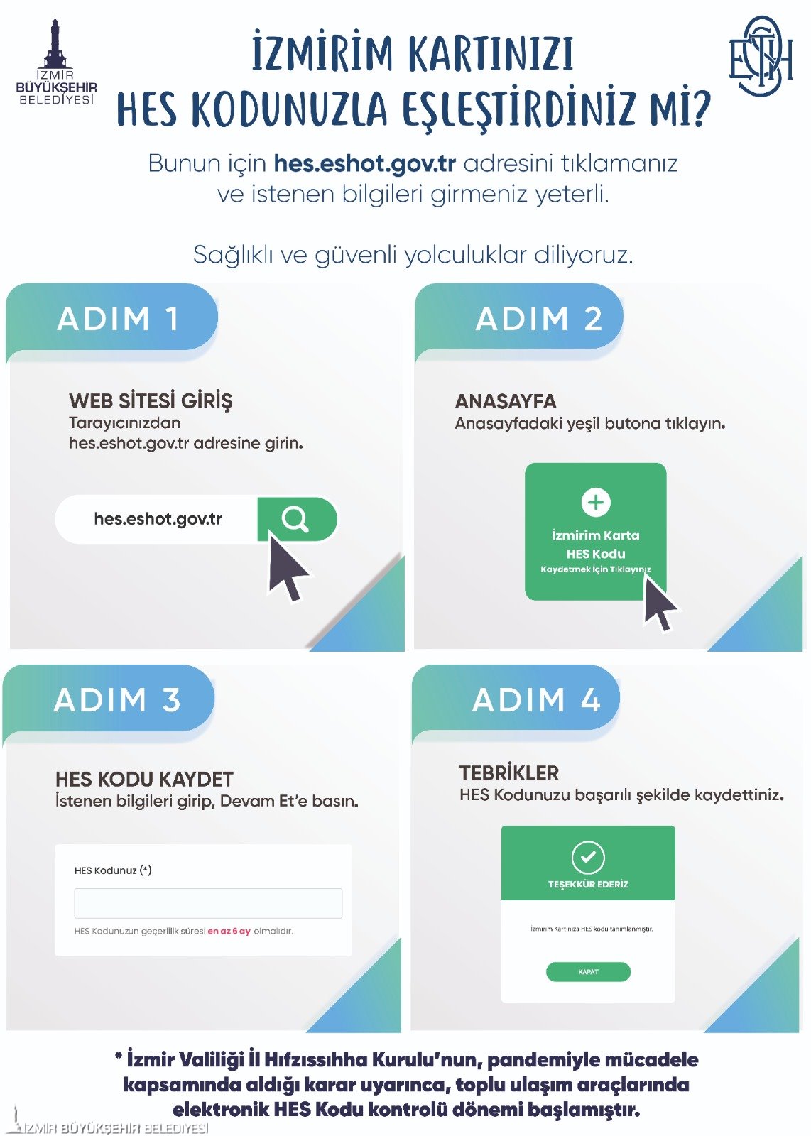 İçişleri Bakanlığı’nın pandemiyle mücadele kapsamında çıkardığı genelge ve İzmir Valiliği İl Hıfzıssıhha Kurulu’nun buna istinaden aldığı karar gereğince; HES Kodu tanımlaması yapılmayan İzmirim Kartlar, 11 Ocak Pazartesi sabahından itibaren toplu ulaşıma kapatılacak. İzmir Büyükşehir Belediyesi, vatandaşların mağduriyet yaşamaması için kullandıkları İzmirim Kartlara HES kodlarını en kısa sürede tanımlama çağrısı yaptı.ESHOT Genel Müdürlüğü verilerine göre, 30 Ekim’den bu yana aktif kullanılan İzmirim Kartların yaklaşık yüzde 57’sine HES Kodu tanımlandı. Tanımlama işleminde son iki güne girilirken; halen işlemi gerçekleştirmeyen vatandaşlara, şu önemli çağrı yapıldı:Son güne bırakmayın“İnternet üzerinden beş dakikada yapılabilen tanımlama işlemini ihmal etmeyin, mağduriyet yaşamayın! Son güne de bırakmayın ki sisteme aşırı yüklenmeden kaynaklanabilecek olası sıkıntılarla da karşılaşmayın. 11 Ocak’tan önce, kullandığınız İzmirim Kart ile HES kodunuzu eşleştirin; toplu ulaşımdan sorunsuz yararlanmayı devam edin.”Eşleştirme nasıl yapılıyor?ESHOT Genel Müdürlüğü, vatandaşların, HES kodlarını ve TC kimlik numaralarını, kullandıkları İzmirim Kart ile eşleştirebilmesi için özel bir internet sitesi oluşturdu. “hes.eshot.gov.tr” adresli sitede, yalnızca bir İzmirim Kart için eşleştirme yapılabiliyor. Kişiselleştirilmiş (fotoğraflı) ya da hamiline tüm İzmirim Kartların, kişisel HES kodları ile eşleştirilmesi gerekiyor. Kullanımı oldukça kolay tasarlanan sitede, istenen bilgileri girilerek kayıt yaptırılabiliyor. Ayrıca, İzmir Büyükşehir Belediyesi'nin, metro istasyonlarında, vapur iskelelerinde, çeşitli hizmet binalarında veosyal tesislerde bulunan dijital bilgilendirme kiosklarında da eşleştirme işlemi yapılıyor.