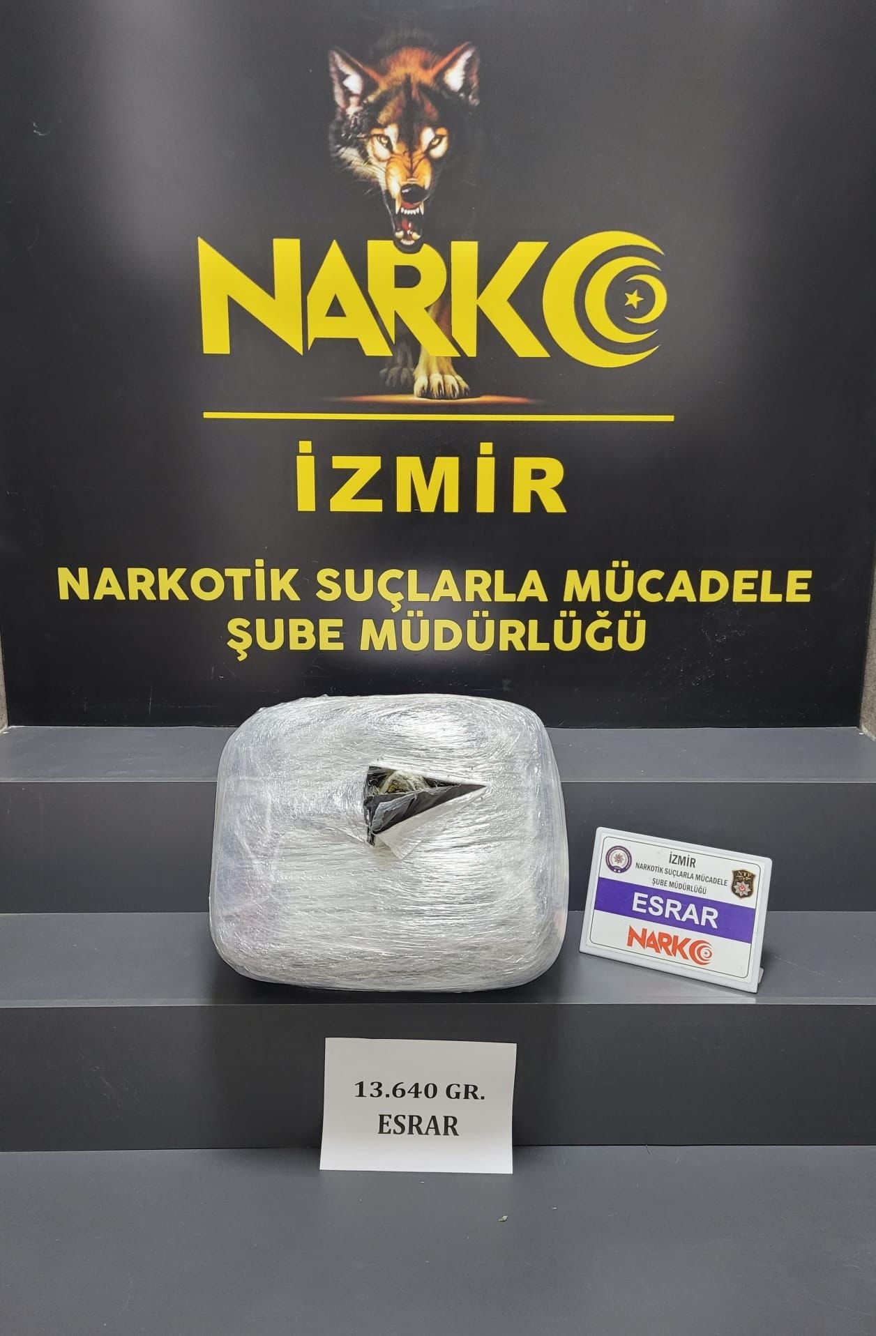 Ekipler, Ö.A. (20) adlı bir kişinin de şehirlerarası otobüs ile İzmir'e yüklü miktarda uyuşturucu madde getireceği bilgisi üzerine harekete geçti. İzmir Şehirlerarası Otobüs Terminali'nde plakası belirlenen otobüsün perona yanaşmasının ardından şüpheli, gözaltına alındı. Ö.A.'nın valizinde yapılan aramada ise 13 kilo 640 gram skunk esrar maddesi ele geçirildi.