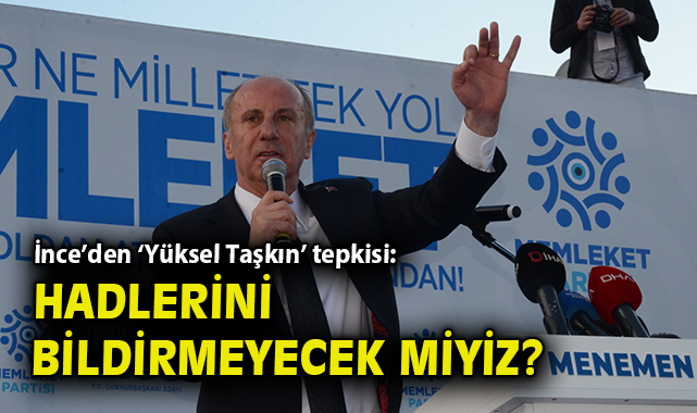 CHP’nin İzmir 1. Bölge 1. Sıra adayı Yüksel Taşkın’a tepki gösteren İnce, “93 yıl önce burada cumhuriyete saldırılar oldu. 100 yıl boyunca bu saldırılar bitmedi. Cumhuriyete, kurucularına ayyaş diyenler oldu. Reklam arası diyenler oldu. Tam 21 yıldır bunlar iktidardayken başka bir şey oldu. Atatürk’ün partisi CHP, İzmir’de birinci sıraya Taraf gazetesinin yazarını koydular. Hayatta bu kadar canımı acıtan ikinci bir liste olmadı. Kemalizm ırkçılıktır diyor, bunu diyen birisi İzmir’de liste başı. Ey Atatürkçü İzmirliler, bunlara haddini bildirmeyecek misiniz? Memleket Partisi Atatürk’ü sevenleri partisidir” ifadelerini kullandı.
