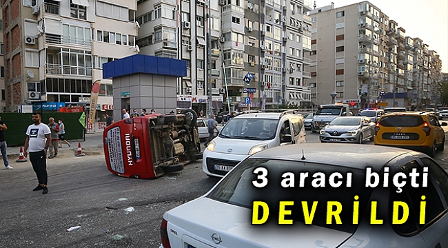 Alınan bilgiye göre, sürücüsünün ismi henüz öğrenilmeyen 35 AR 7169 plakalı panelvan, İnönü Caddesi Poligon Bölgesi'nde park halindeki araçlara çarptıktan sonra devrildi.Çevredekilerin ihbarı üzerine bölgeye sağlık, itfaiye ve polis ekipleri sevk edildi.Araçta sıkışan ve ekiplerin müdahalesi sonucu çıkarılan 3 kişi Dokuz Eylül Üniversitesi Tıp Fakültesi Hastanesi'ne kaldırıldı.Kaza nedeniyle trafiğe kapanan yol, aracın çekilmesiyle normale döndü.Öte yandan kaza anı bir iş yerinin güvenlik kamerasınca kaydedildi.Görüntülerde aracın park halindeki araçlara çarpması ve çevredekilerin yardım amacıyla kaza yerine koşmaları yer alıyor.