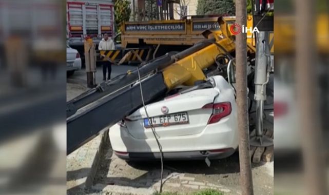 İnşaatta kullanılan vinç otomobilin üzerine devrildi