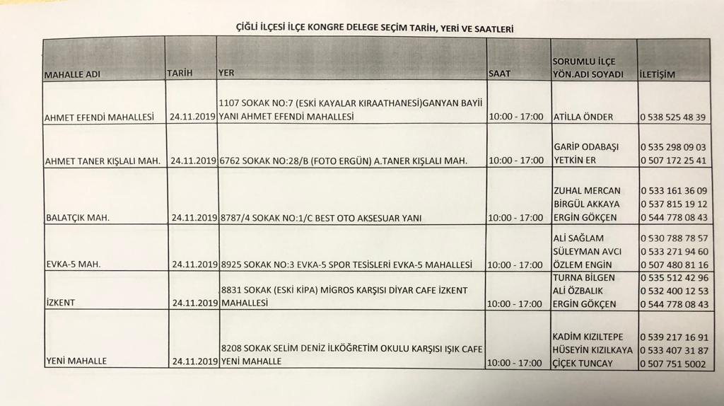 Çiğli’nin seçime gitmeyen Yeni Mahalle, Ahmet Efendi, Ahmet Taner Kışlalı, Balatçık, Evka-5 ve İzkent mahalleleri 24 Aralık Pazar günü sandık başına giderek delegelerini belirleyecek.