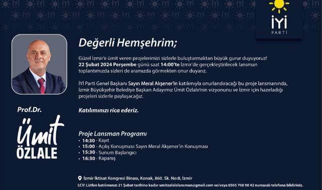 ÖNCÜŞEHİR - İYİ Parti İzmir Büyükşehir Belediye Başkan Adayı Prof. Dr. Ümit Özlale, 22 Şubat Perşembe günü İzmir İktisat Kongresi Binası’nda kente dair projelerini anlatmak için tanıtım toplantısı düzenleyecek. Toplantıya, İYİ Parti Genel Başkanı Meral Akşener de katılacak.