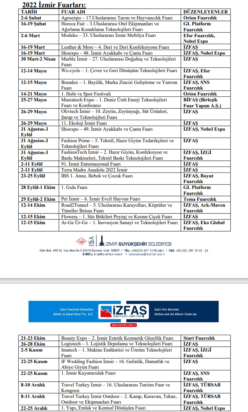COVID-19 Güvenli Alan Sertifikası’nı almaya hak kazandı. 2021 yılında 4’ü misafir olmak üzere toplam 13 fuar ve 6 etkinlik düzenlendi. Fiziksel olarak düzenlenen fuarların büyük çoğunluğu Ağustos ve Aralık ayları arasında, dört ay gibi kısa bir süre içerisinde gerçekleşti.2021 ÜLKE EKONOMİSİNE FUAR BEREKETİ 2021’de düzenlenen ilk fiziksel İZFAŞ fuarı, Türkiye doğal taş ihracatının can damarı Marble İzmir Fuarı oldu. Bu yıl özellikle konteyner ve navlun fiyatlarındaki büyük artışlara rağmen sektör 2 milyar dolar hedefine ulaştı. ABD ve Avrupa’ya yapılan nitelikli ziyaretçi çalışmaları, yıl sonu rakamlarında artış gösteren bu ülkelerin ihracatına katkı sağladı. 90. İzmir Enternasyonal Fuarı (İEF), geçmiş değerlere ayna tutarak geleceğe açılan önemli bir kapı oldu. Birleşmiş Kentler ve Yerel Yönetimler Teşkilatı (UCLG) Kültür Zirvesi’nin dördüncüsünü Türkiye’de ilk kez İEF ile eş zamanlı olarak düzenlendi. Fuarın uluslararası ticaret platformu olan İzmir İş Günleri’nde iklim krizine küresel çözümler sunuldu. Türkiye fuarcılığının yenilikçi firması Nobel Expo ortaklığı ile 47. Shoexpo Ayakkabı ve Çanta Fuarı düzenlendi. Tekstil üretimini İzmir ve Ege Bölgesi’nde daha önemli hale getirmek amacıyla Fashion Prime kapsamında İZGİ Fuarcılık ile güçlerini birleştiren İZFAŞ, konfeksiyon