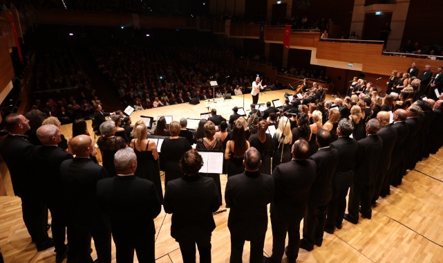 İzmir Büyükşehir Belediyesi, müzikseverlere Klasik Türk Müziği Korosu eşliğinde unutulmaz bir akşam yaşattı. "Sonbahar Şarkıları" temalı konser, mevsimin hüzünlü ve romantik ezgilerini sanatla buluşturdu. Ahmed Adnan Saygun Sanat Merkezi'nde gerçekleştirilen konserde, şef Hüseyin Tolu yönetimindeki 120 kişilik dev koro, Türk müziğinin hüzzam, nihavend, kürdilihicazkar makamlarının seçkin eserlerini seslendirdi.İzmir Büyükşehir Belediyesi Klasik Türk Müziği Korosu'nun sunduğu bu özel etkinlik halka açık ve ücretsiz olarak düzenlenirken, salonu dolduran sanatseverler hep bir ağızdan şarkılara eşlik etti.