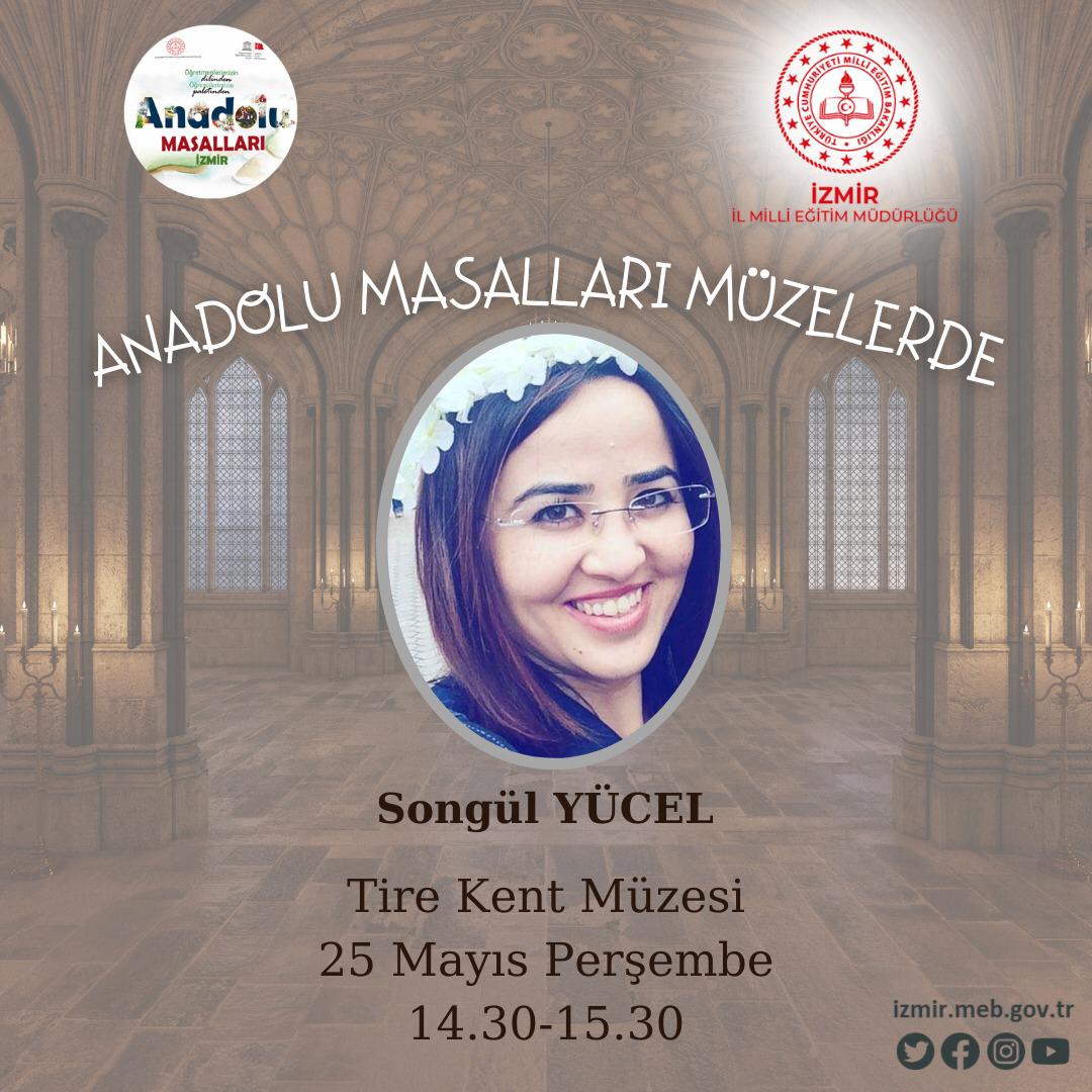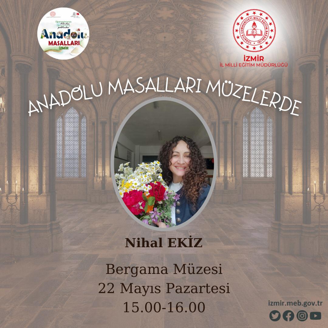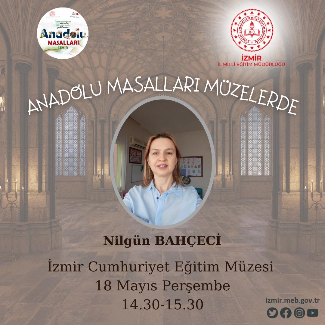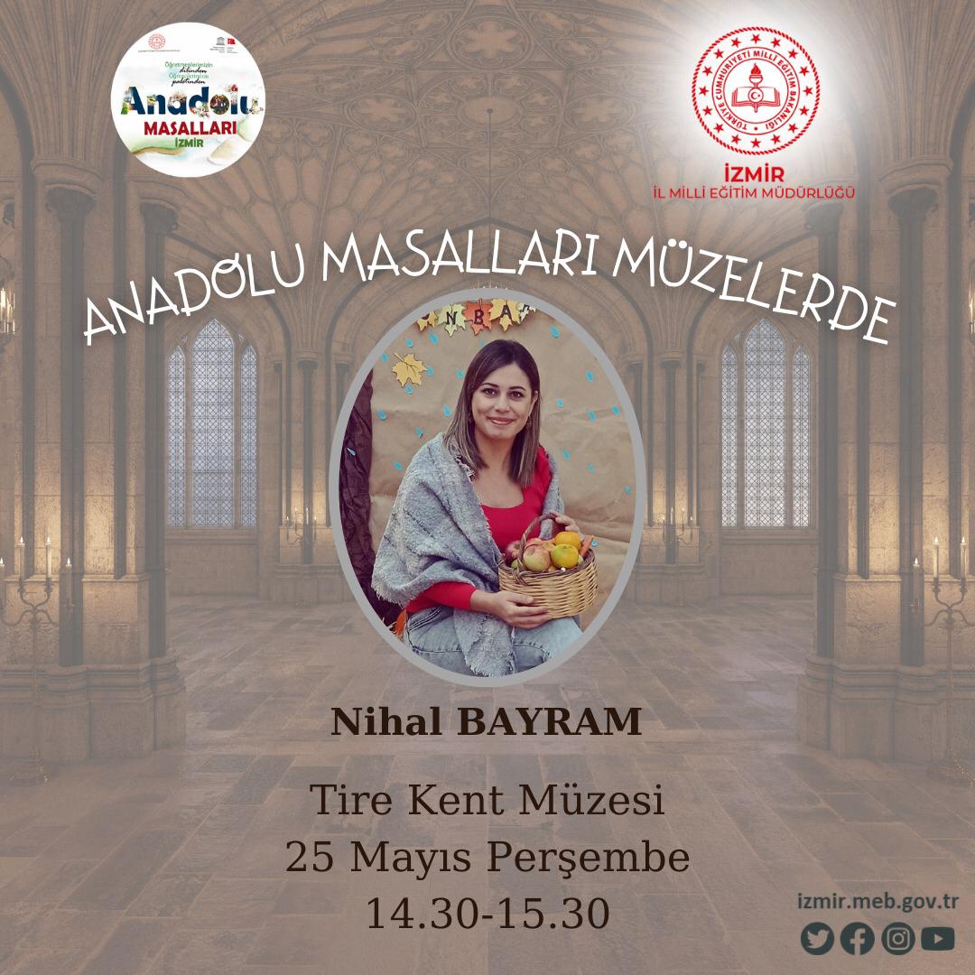 Milletin ortak değerlerinin ülkeye ait motiflerle nesilden nesillere aktarılması ve çocukların hayal güçlerinin geliştirilmesi amacıyla hayata geçirilen "Anadolu Masalları Projesi" Milli Eğitim Bakanlığı ve UNESCO Türkiye Milli Komisyonu iş birliğinde gerçekleştiriliyor. İzmir İl Milli Eğitim Müdürlüğü proje kapsamında İzmir Cumhuriyet Eğitim Müzesinde " İzmir Masal Gecesi" ve "Anadolu Masalları Atölyeleri" adı altında faaliyetlerine devam ediyor. 18-24 Mayıs Müzeler Haftası olması sebebi ile İzmir İl Milli Eğitim Müdürlüğü “Anadolu Masalları Müzelerde” başlığından yola çıkarak farklı etkinlikler planladı. İzmir Cumhuriyet Eğitim Müzesi’nde 18 Mayıs 2023 Perşembe günü 14.30-15.30 saatleri arasında Nilgün Bahçeci, aynı tarihte Teos Antik Kent’te 09.00-12.00 saatleri arasında Neslihan Çermik ve Emine Beyaz Şenyuva, Bergama Müzesi’nde 22 Mayıs 2023 Pazartesi günü 15.00-16.00 saatleri arasında Nihal Ekiz, Tire Kent Müzesi’nde 25 Mayıs Perşembe günü 14.30-15.30 saatleri arasında Songül Yücel ve Nihal Bayram öğrencileri Anadolu Masalları ile buluşturacak.