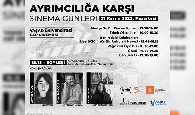 İzmir Büyükşehir Belediyesi kentte her türlü ayrımcılığa karşı mücadele etmek ve bir arada yaşam kültürünün toplumun her kesimine yayılmasını sağlamak amacıyla 21 ve 23 Kasım’da Yaşar Üniversitesi Cep Sineması’nda Ayrımcılığa Karşı Sinema Günleri düzenliyor.